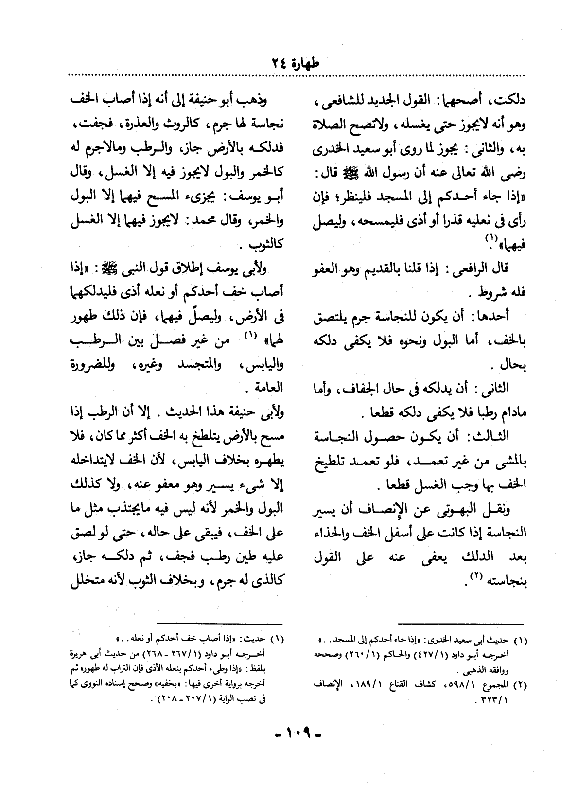 (1) حديث: " إذا أصاب خف أحدكم أو نعله. . . ". أخرجه أبو داود (1 / 267 - 268) من حديث أبي هريرة بلفظ: " إذا وطئ أحدكم نعله الأذى فإن التراب طهوره " ثم أخرجه برواية أخرى فيها: " بخفيه " وصحح إسناده النووي كما في نصب الراية (1 / 207 - 208) .