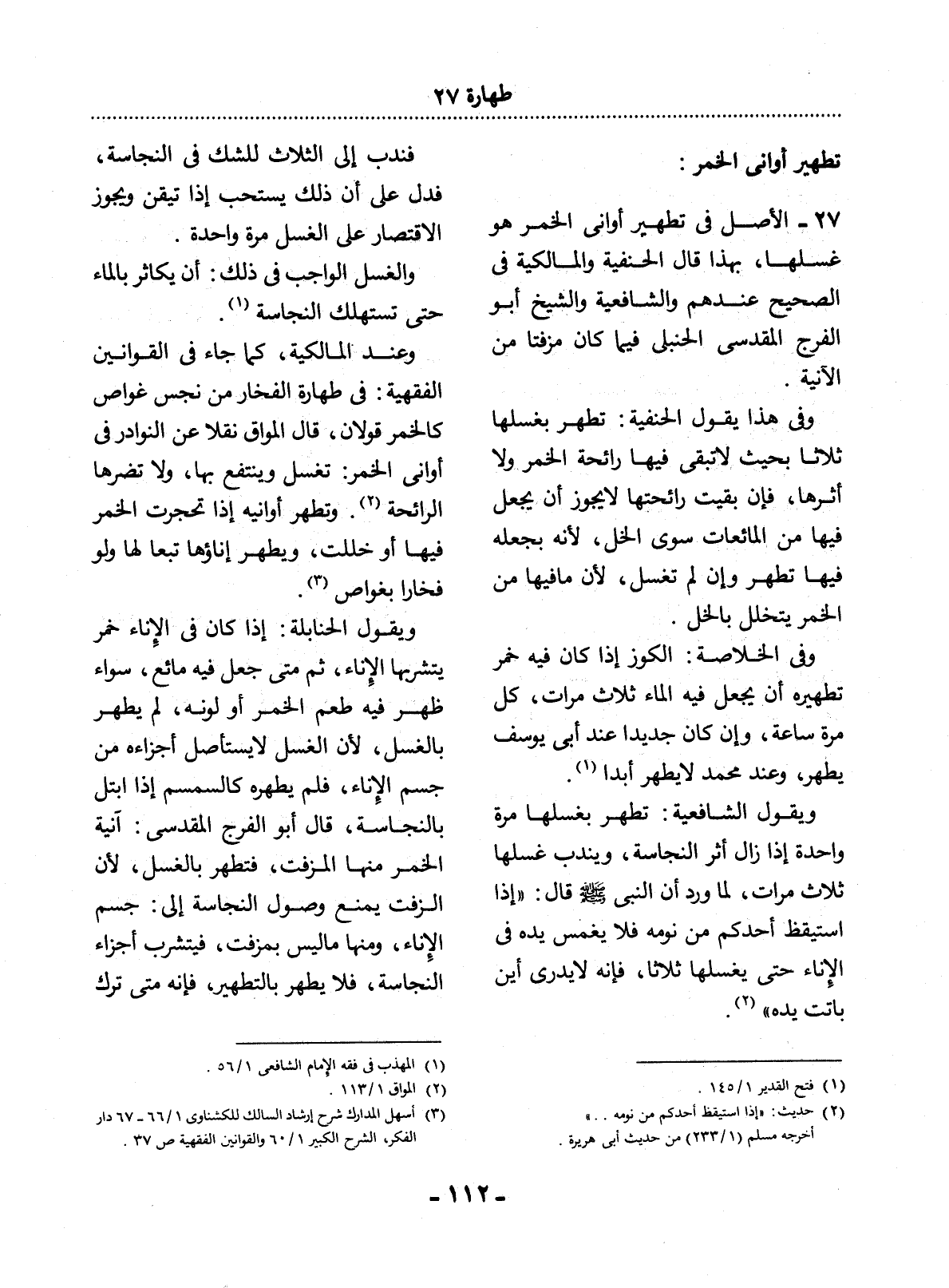 27 - الأَْصْل فِي تَطْهِيرِ أَوَانِي الْخَمْرِ هُوَ غَسْلُهَا، بِهَذَا قَال الْحَنَفِيَّةُ وَالْمَالِكِيَّةُ فِي الصَّحِيحِ عِنْدَهُمْ وَالشَّافِعِيَّةُ وَالشَّيْخُ أَبُو الْفَرَجِ الْمَقْدِسِيُّ الْحَنْبَلِيُّ فِيمَا كَانَ مُزَفَّتًا مِنَ الآْنِيَةِ.