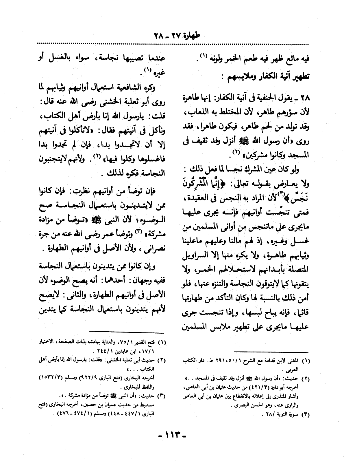 28 - يَقُول الْحَنَفِيَّةُ فِي آنِيَةِ الْكُفَّارِ: إِنَّهَا طَاهِرَةٌ لأَِنَّ سُؤْرَهُمْ طَاهِرٌ؛ لأَِنَّ الْمُخْتَلِطَ بِهِ اللُّعَابُ، وَقَدْ تَوَلَّدَ مِنْ لَحْمٍ طَاهِرٍ، فَيَكُونُ طَاهِرًا، فَقَدْ رُوِيَ أَنَّ رَسُول اللَّهِ صَلَّى اللَّهُ عَلَيْهِ وَسَلَّمَ أَنْزَل وَفْدَ ثَقِيفٍ فِي الْمَسْجِدِ وَكَانُوا مُشْرِكِينَ (2) .