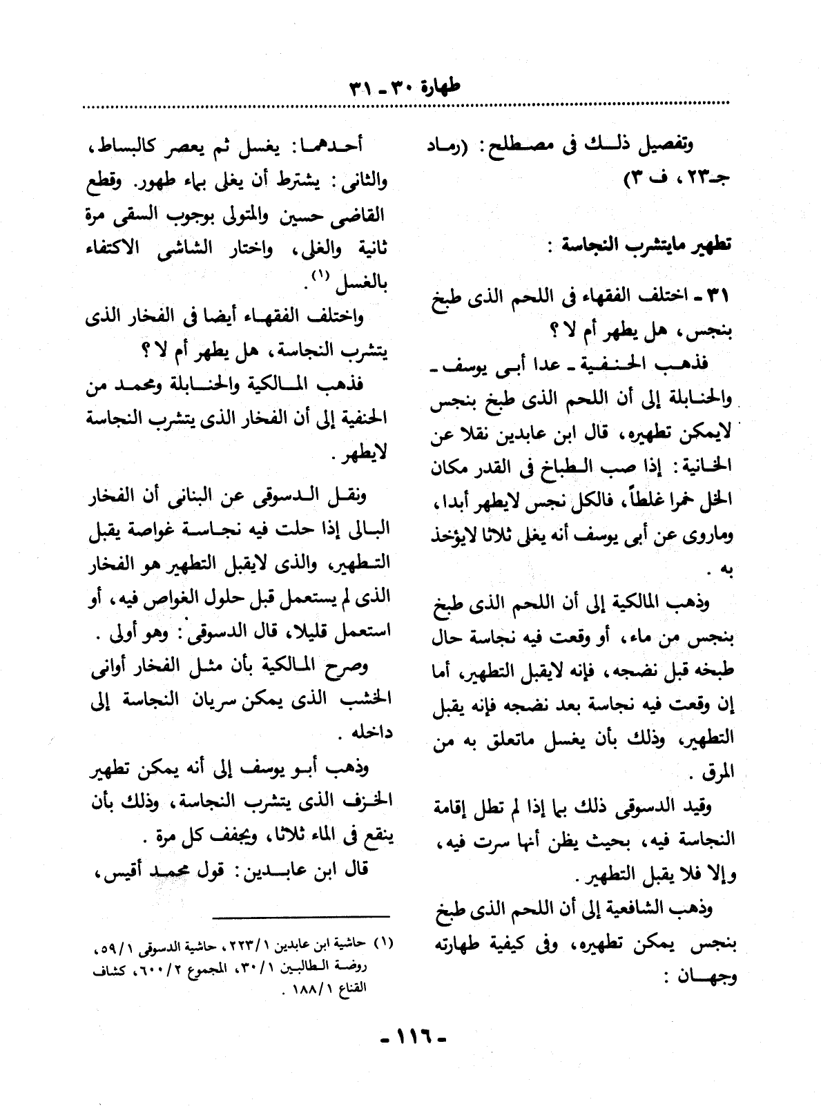 31 - اخْتَلَفَ الْفُقَهَاءُ فِي اللَّحْمِ الَّذِي طُبِخَ بِنَجِسٍ، هَل يَطْهُرُ أَمْ لاَ؟