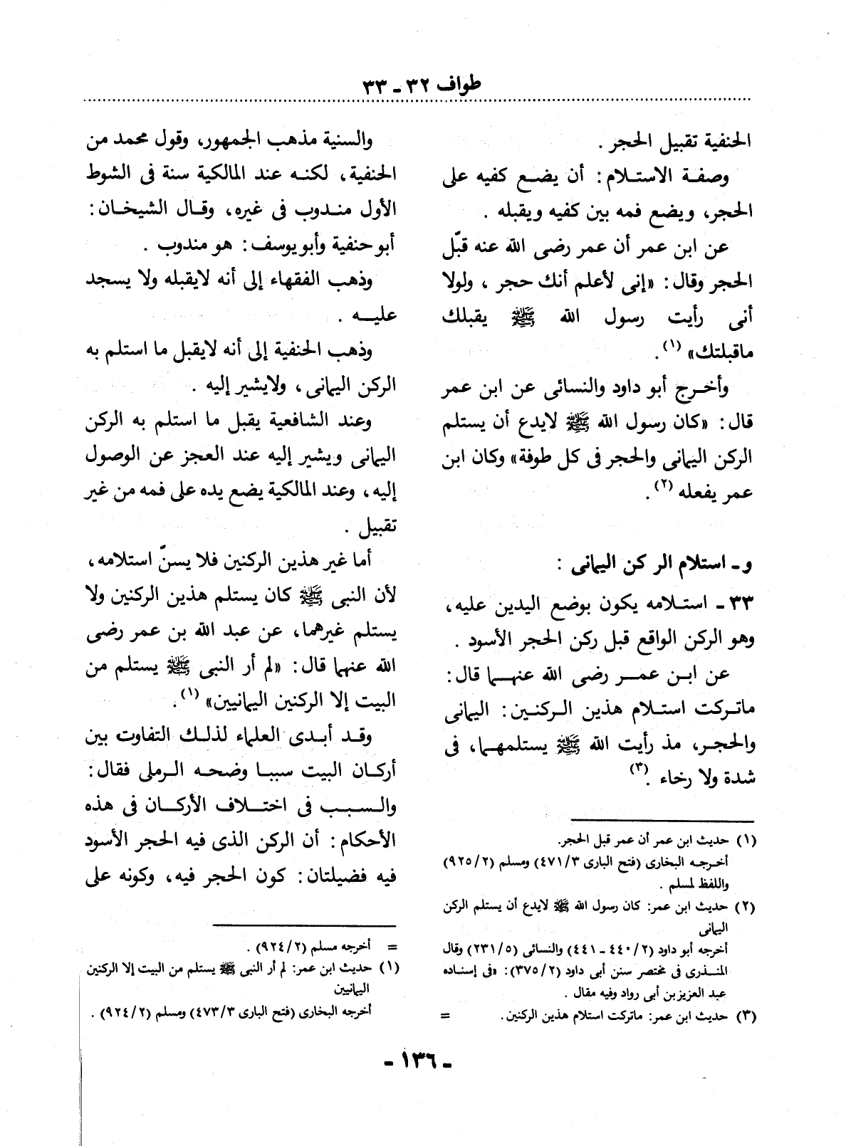 33 - اسْتِلاَمُهُ يَكُونُ بِوَضْعِ الْيَدَيْنِ عَلَيْهِ، وَهُوَ الرُّكْنُ الْوَاقِعُ قِبَل رُكْنِ الْحَجَرِ الأَْسْوَدِ.
