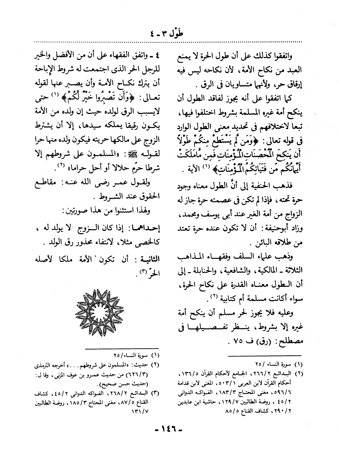 وَاتَّفَقُوا كَذَلِكَ عَلَى أَنَّ طَوْل الْحُرَّةِ لاَ يَمْنَعُ الْعَبْدَ مِنْ نِكَاحِ الأَْمَةِ؛ لأَِنَّ نِكَاحَهُ لَيْسَ فِيهِ إِرْقَاقُ حُرٍّ، وَلأَِنَّهُمَا مُتَسَاوِيَانِ فِي الرِّقِّ. كَمَا اتَّفَقُوا عَلَى أَنَّهُ يَجُوزُ لِفَاقِدِ الطَّوْل أَنْ يَنْكِحَ أَمَةَ غَيْرِهِ الْمُسْلِمَةَ بِشُرُوطٍ اخْتَلَفُوا فِيهَا، تَبَعًا لاِخْتِلاَفِهِمْ فِي تَحْدِيدِ مَعْنَى الطَّوْل الْوَارِدِ فِي قَوْله تَعَالَى: {وَمَنْ لَمْ يَسْتَطِعْ مِنْكُمْ طَوْلاً أَنْ يَنْكِحَ الْمُحْصَنَاتِ الْمُؤْمِنَاتِ فَمِنْ مَا مَلَكَتْ أَيْمَانُكُمْ مِنْ فَتَيَاتِكُمُ الْمُؤْمِنَاتِ} (1) الآْيَةَ. فَذَهَبَ الْحَنَفِيَّةُ إِلَى أَنَّ الطَّوْل مَعْنَاهُ وُجُودُ حُرَّةٍ تَحْتَهُ، فَإِذَا لَمْ تَكُنْ فِي عِصْمَتِهِ حُرَّةٌ جَازَ لَهُ الزَّوَاجُ مِنْ أَمَةِ الْغَيْرِ عِنْدَ أَبِي يُوسُفَ وَمُحَمَّدٍ، وَزَادَ أَبُو حَنِيفَةَ: أَنْ لاَ تَكُونَ عِنْدَهُ حُرَّةٌ تَعْتَدُّ مِنْ طَلاَقِهِ الْبَائِنِ. وَذَهَبَ عُلَمَاءُ السَّلَفِ وَفُقَهَاءُ الْمَذَاهِبِ الثَّلاَثَةِ - الْمَالِكِيَّةِ، وَالشَّافِعِيَّةِ، وَالْحَنَابِلَةِ - إِلَى أَنَّ الطَّوْل مَعْنَاهُ الْقُدْرَةُ عَلَى نِكَاحِ الْحُرَّةِ، سَوَاءٌ أَكَانَتْ مُسْلِمَةً أَمْ كِتَابِيَّةً (2) .