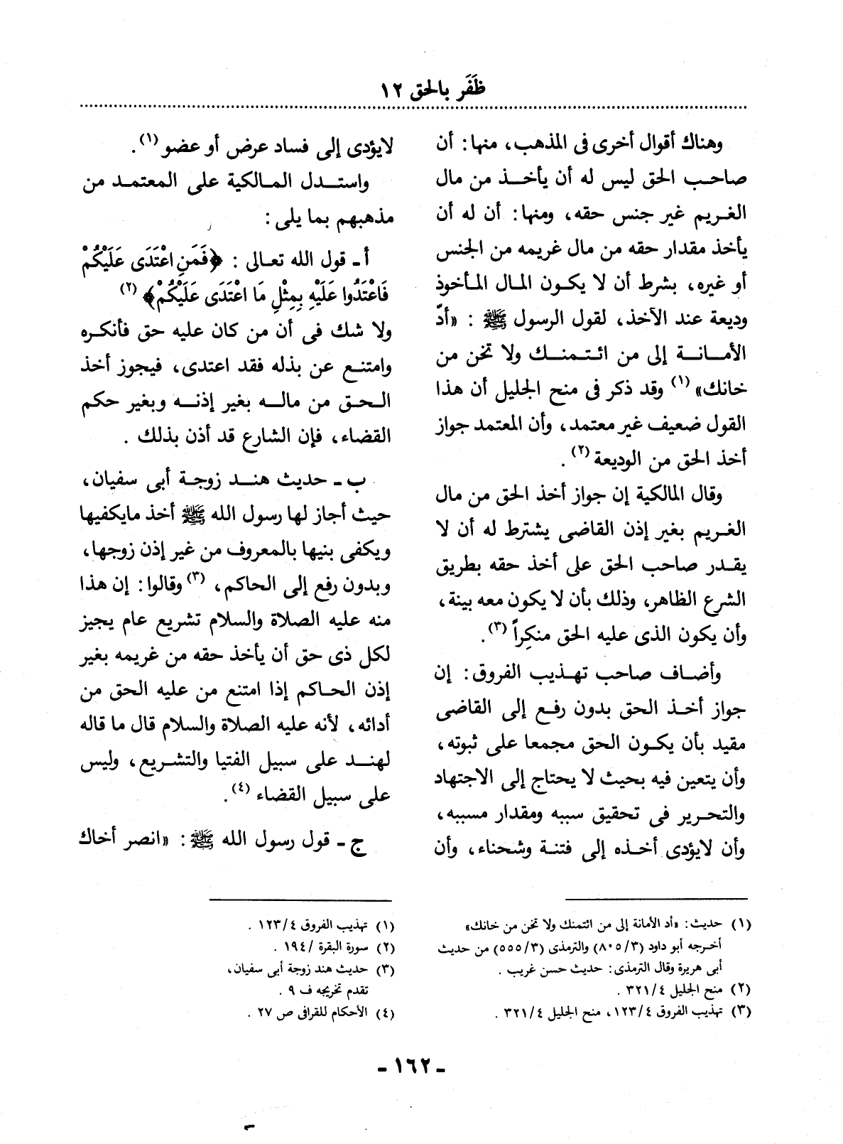 ب - حَدِيثُ هِنْدٍ زَوْجَةِ أَبِي سُفْيَانَ، حَيْثُ أَجَازَ لَهَا رَسُول اللَّهِ صَلَّى اللَّهُ عَلَيْهِ وَسَلَّمَ أَخْذَ مَا يَكْفِيهَا وَيَكْفِي بَنِيهَا بِالْمَعْرُوفِ مِنْ غَيْرِ إِذْنِ زَوْجِهَا، وَبِدُونِ رَفْعٍ إِلَى الْحَاكِمِ (3) ، وَقَالُوا: إِنَّ هَذَا مِنْهُ عَلَيْهِ الصَّلَاةُ وَالسَّلَامُ تَشْرِيعٌ عَامٌّ يُجِيزُ لِكُل ذِي حَقٍّ أَنْ يَأْخُذَ حَقَّهُ مِنْ غَرِيمِهِ بِغَيْرِ إِذْنِ الْحَاكِمِ إِذَا امْتَنَعَ مَنْ عَلَيْهِ الْحَقُّ مِنْ أَدَائِهِ، لأَِنَّهُ عَلَيْهِ الصَّلَاةُ وَالسَّلَامُ قَال مَا قَالَهُ لِهِنْدٍ عَلَى سَبِيل الْفُتْيَا وَالتَّشْرِيعِ، وَلَيْسَ عَلَى سَبِيل الْقَضَاءِ (4) .