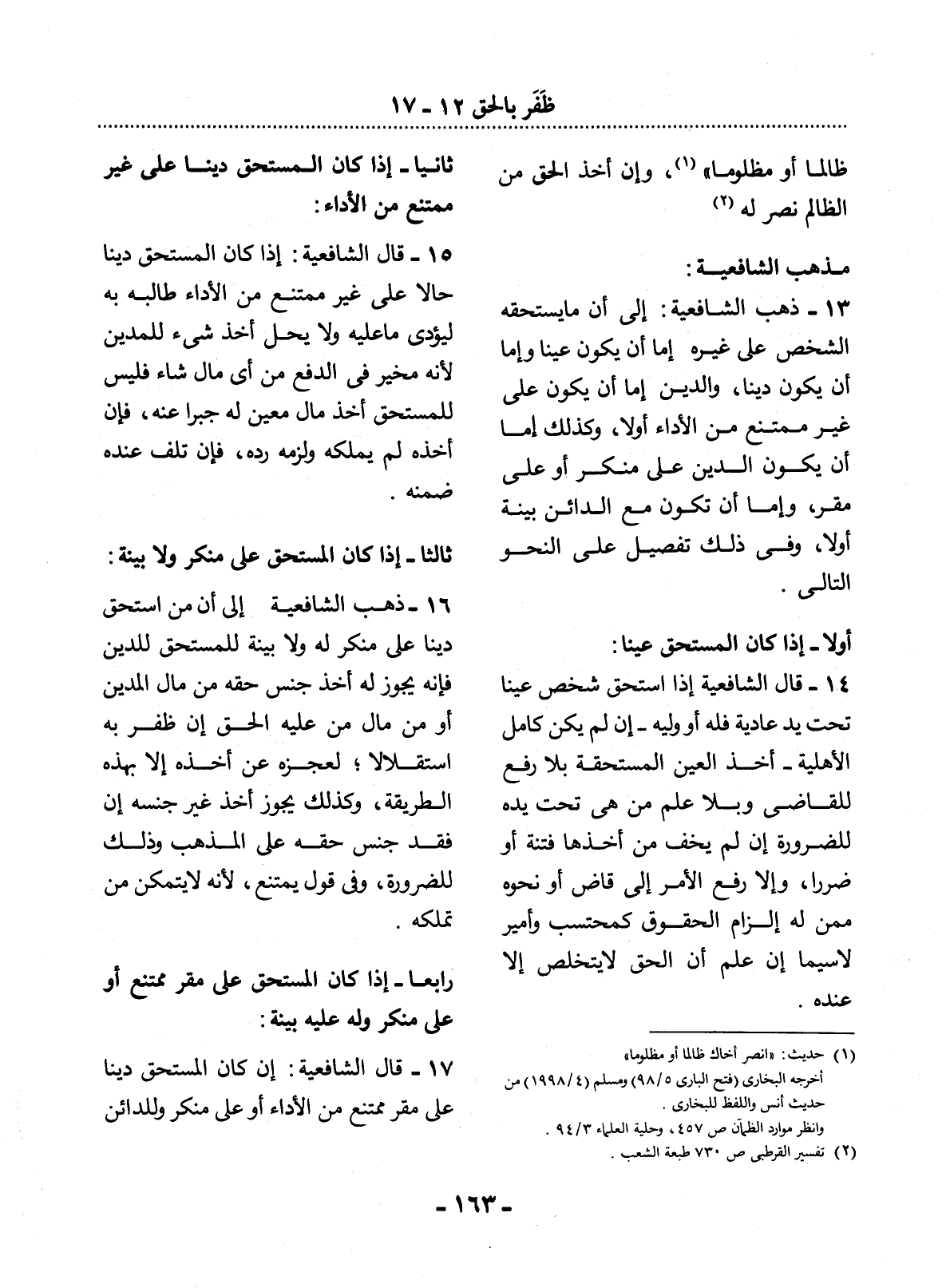 13 - ذَهَبَ الشَّافِعِيَّةُ: إِلَى أَنَّ مَا يَسْتَحِقُّهُ الشَّخْصُ عَلَى غَيْرِهِ إِمَّا أَنْ يَكُونَ عَيْنًا وَإِمَّا أَنْ يَكُونَ دَيْنًا، وَالدَّيْنُ إِمَّا أَنْ يَكُونَ عَلَى غَيْرِ مُمْتَنِعٍ مِنَ الأَْدَاءِ أَوْ لاَ، وَكَذَلِكَ إِمَّا أَنْ يَكُونَ الدَّيْنُ عَلَى مُنْكِرٍ أَوْ عَلَى مُقِرٍّ، وَإِمَّا أَنْ تَكُونَ مَعَ الدَّائِنِ بَيِّنَةٌ أَوْ لاَ، وَفِي ذَلِكَ تَفْصِيلٌ عَلَى النَّحْوِ التَّالِي.