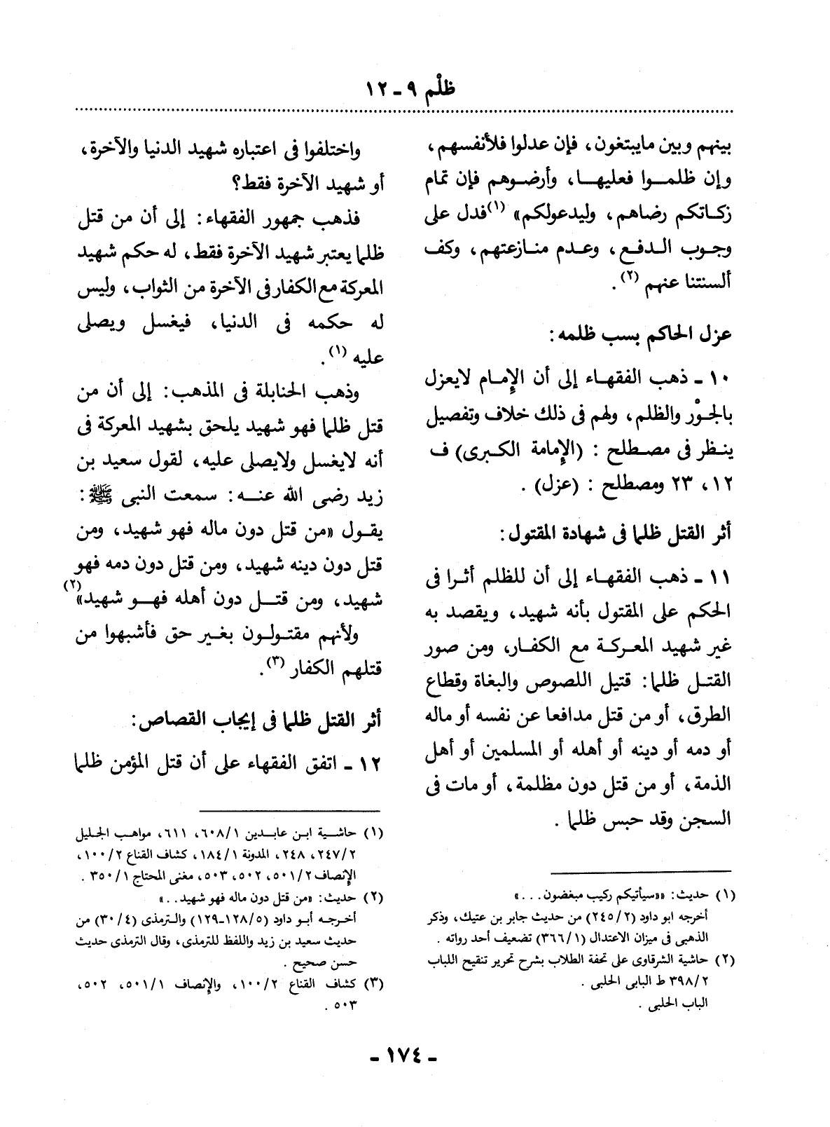 11 - ذَهَبَ الْفُقَهَاءُ إِلَى أَنَّ لِلظُّلْمِ أَثَرًا فِي الْحُكْمِ عَلَى الْمَقْتُول بِأَنَّهُ شَهِيدٌ، وَيُقْصَدُ بِهِ غَيْرُ شَهِيدِ الْمَعْرَكَةِ مَعَ الْكُفَّارِ، وَمِنْ صُوَرِ الْقَتْل ظُلْمًا: قَتِيل اللُّصُوصِ وَالْبُغَاةِ وَقُطَّاعِ الطُّرُقِ، أَوْ مَنْ قُتِل مُدَافِعًا عَنْ نَفْسِهِ أَوْ مَالِهِ أَوْ دَمِهِ أَوْ دِينِهِ أَوْ أَهْلِهِ أَوِ الْمُسْلِمِينَ أَوْ أَهْل الذِّمَّةِ، أَوْ مَنْ قُتِل دُونَ مَظْلَمَةٍ، أَوْ مَاتَ فِي السِّجْنِ وَقَدْ حُبِسَ ظُلْمًا.