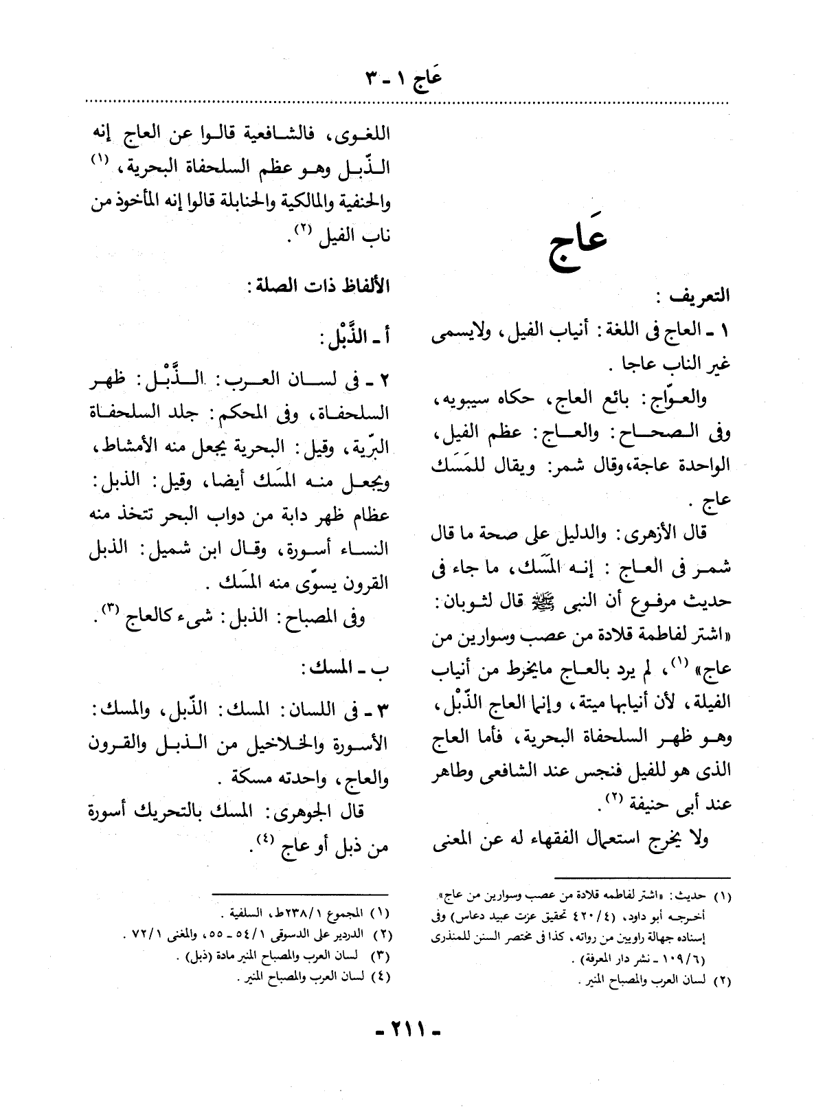 اللُّغَوِيِّ، فَالشَّافِعِيَّةُ قَالُوا عَنِ الْعَاجِ: إِنَّهُ الذَّبْل وَهُوَ عَظْمُ السُّلَحْفَاةِ الْبَحْرِيَّةِ (1) ، وَالْحَنَفِيَّةُ وَالْمَالِكِيَّةُ وَالْحَنَابِلَةُ قَالُوا إِنَّهُ الْمَأْخُوذُ مِنْ نَابِ الْفِيل (2) .