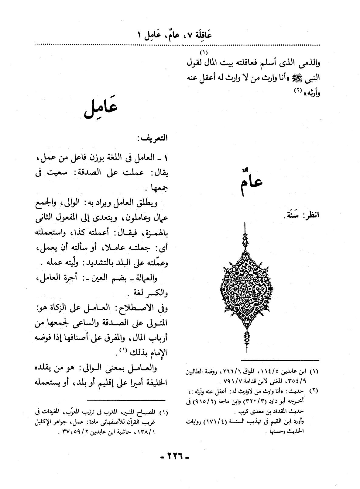 (1) المصباح المنير، المغرب في ترتيب المعرب، المفردات في غريب القرآن للأصفهاني مادة: عمل، جواهر الإكليل 1 / 138، حاشية ابن عابدين 2 / 59، 37.