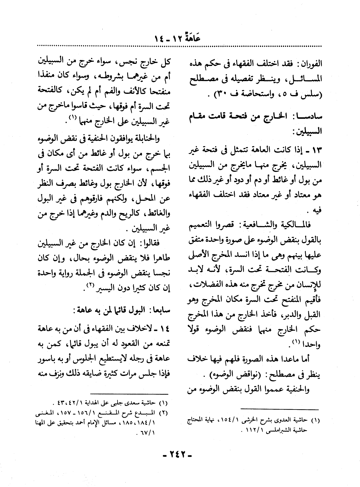 13 - إِذَا كَانَتِ الْعَاهَةُ تَتَمَثَّل فِي فَتْحَةِ غَيْرِ السَّبِيلَيْنِ، يَخْرُجُ مِنْهَا مَا يَخْرُجُ مِنَ السَّبِيلَيْنِ مِنْ بَوْلٍ أَوْ غَائِطٍ أَوْ دَمٍ أَوْ دُودٍ أَوْ غَيْرِ ذَلِكَ مِمَّا هُوَ مُعْتَادٌ أَوْ غَيْرُ مُعْتَادٍ فَقَدِ اخْتَلَفَ الْفُقَهَاءُ فِيهِ.