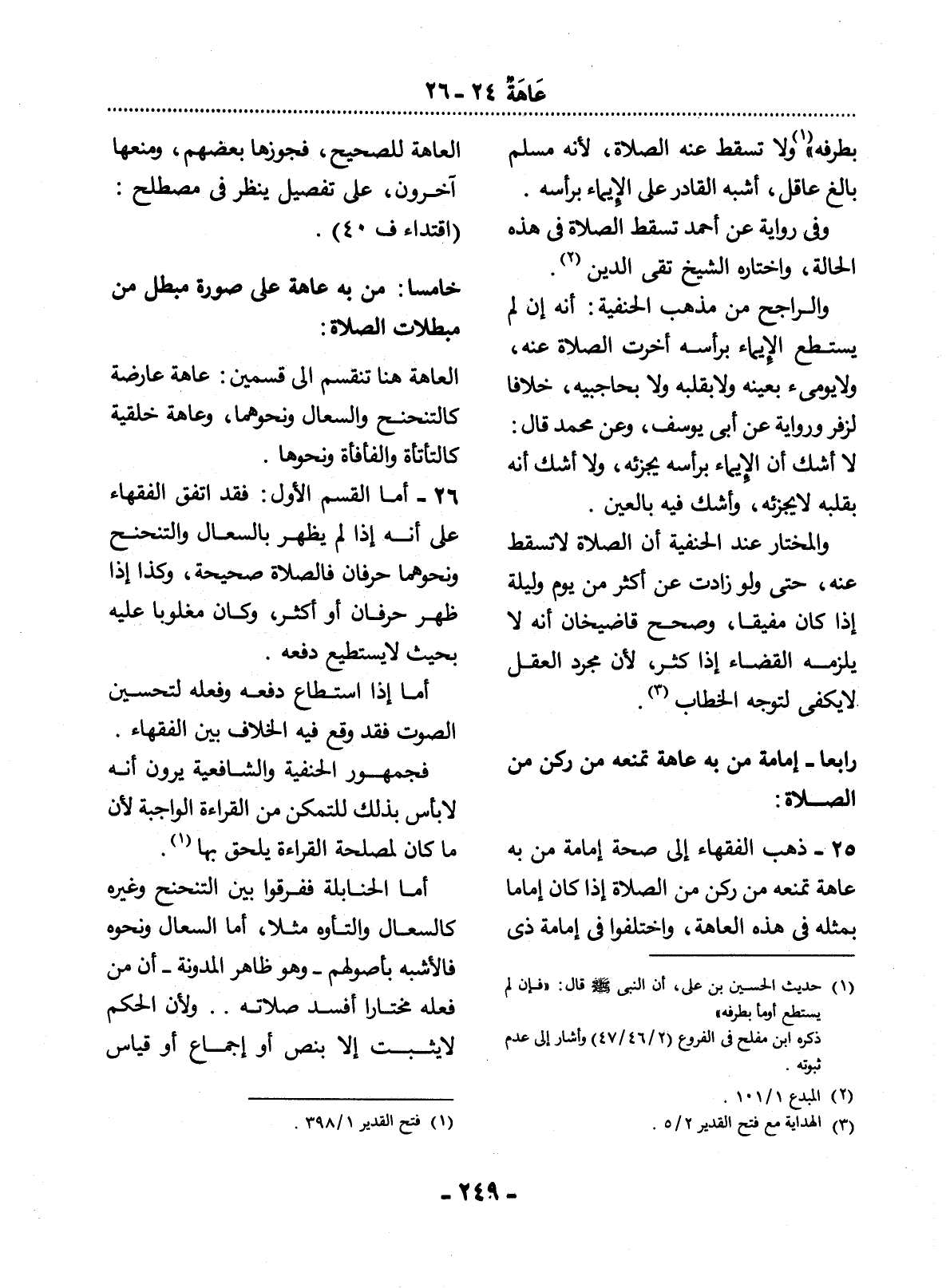 25 - ذَهَبَ الْفُقَهَاءُ إِلَى صِحَّةِ إِمَامَةِ مَنْ بِهِ عَاهَةٌ تَمْنَعُهُ مِنْ رُكْنٍ مِنَ الصَّلاَةِ إِذَا كَانَ إِمَامًا بِمِثْلِهِ فِي هَذِهِ الْعَاهَةِ، وَاخْتَلَفُوا فِي إِمَامَةِ ذِي