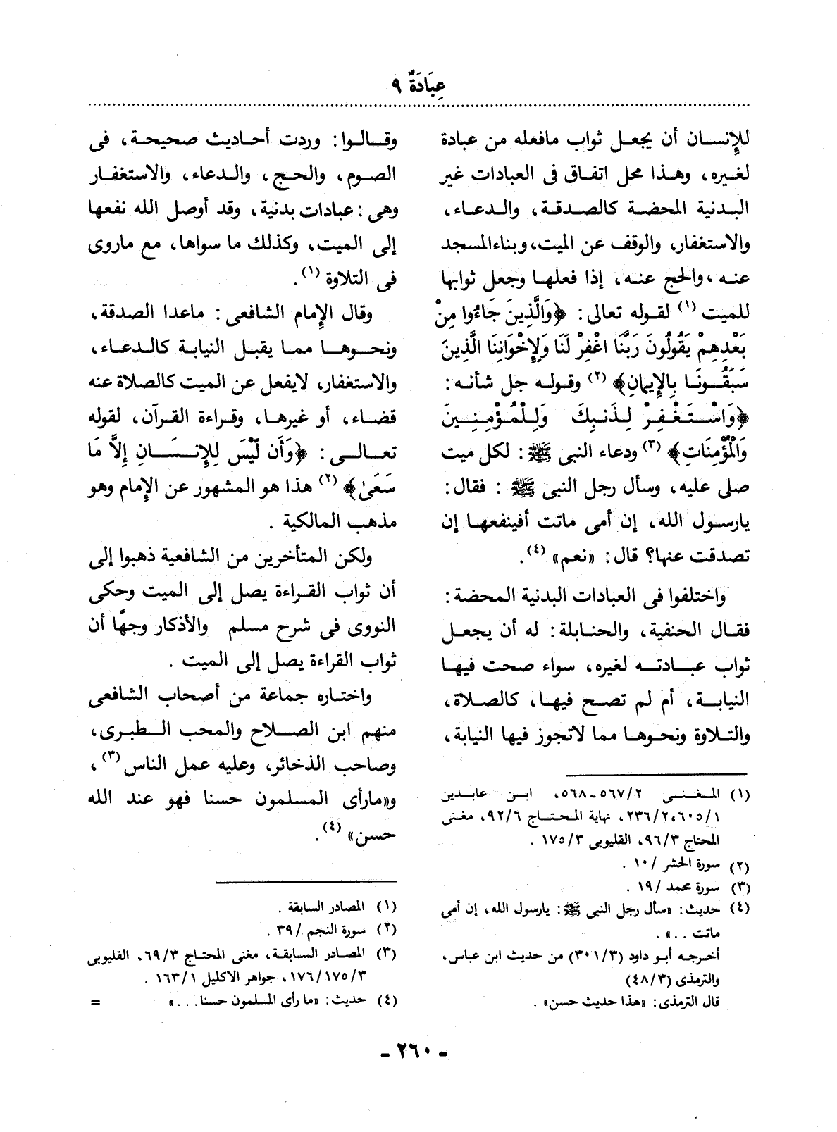 لِلإِْنْسَانِ أَنْ يَجْعَل ثَوَابَ مَا فَعَلَهُ مِنْ عِبَادَةٍ لِغَيْرِهِ، وَهَذَا مَحَل اتِّفَاقٍ فِي الْعِبَادَاتِ غَيْرِ الْبَدَنِيَّةِ الْمَحْضَةِ كَالصَّدَقَةِ، وَالدُّعَاءِ، وَالاِسْتِغْفَارِ، وَالْوَقْفِ عَنِ الْمَيِّتِ، وَبِنَاءِ الْمَسْجِدِ عَنْهُ، وَالْحَجِّ عَنْهُ، إِذَا فَعَلَهَا وَجَعَل ثَوَابَهَا لِلْمَيِّتِ (1) لِقَوْلِهِ تَعَالَى: {وَاَلَّذِينَ جَاءُوا مِنْ بَعْدِهِمْ يَقُولُونَ رَبَّنَا اغْفِرْ لَنَا وَلإِِخْوَانِنَا الَّذِينَ سَبَقُونَا بِالإِْيمَانِ} (2) وَقَوْلُهُ جَل شَأْنُهُ: {وَاسْتَغْفِرْ لِذَنْبِكَ وَلِلْمُؤْمِنِينَ وَالْمُؤْمِنَاتِ} (3) وَدُعَاءُ النَّبِيِّ صَلَّى اللَّهُ عَلَيْهِ وَسَلَّمَ: لِكُل مَيِّتٍ صَلَّى عَلَيْهِ، وَسَأَل رَجُلٌ النَّبِيَّ صَلَّى اللَّهُ عَلَيْهِ وَسَلَّمَ: فَقَال: يَا رَسُول اللَّهِ، إِنَّ أُمِّي مَاتَتْ أَفَيَنْفَعُهَا إِنْ تَصَدَّقْتُ عَنْهَا؟ قَال: نَعَمْ (4) .