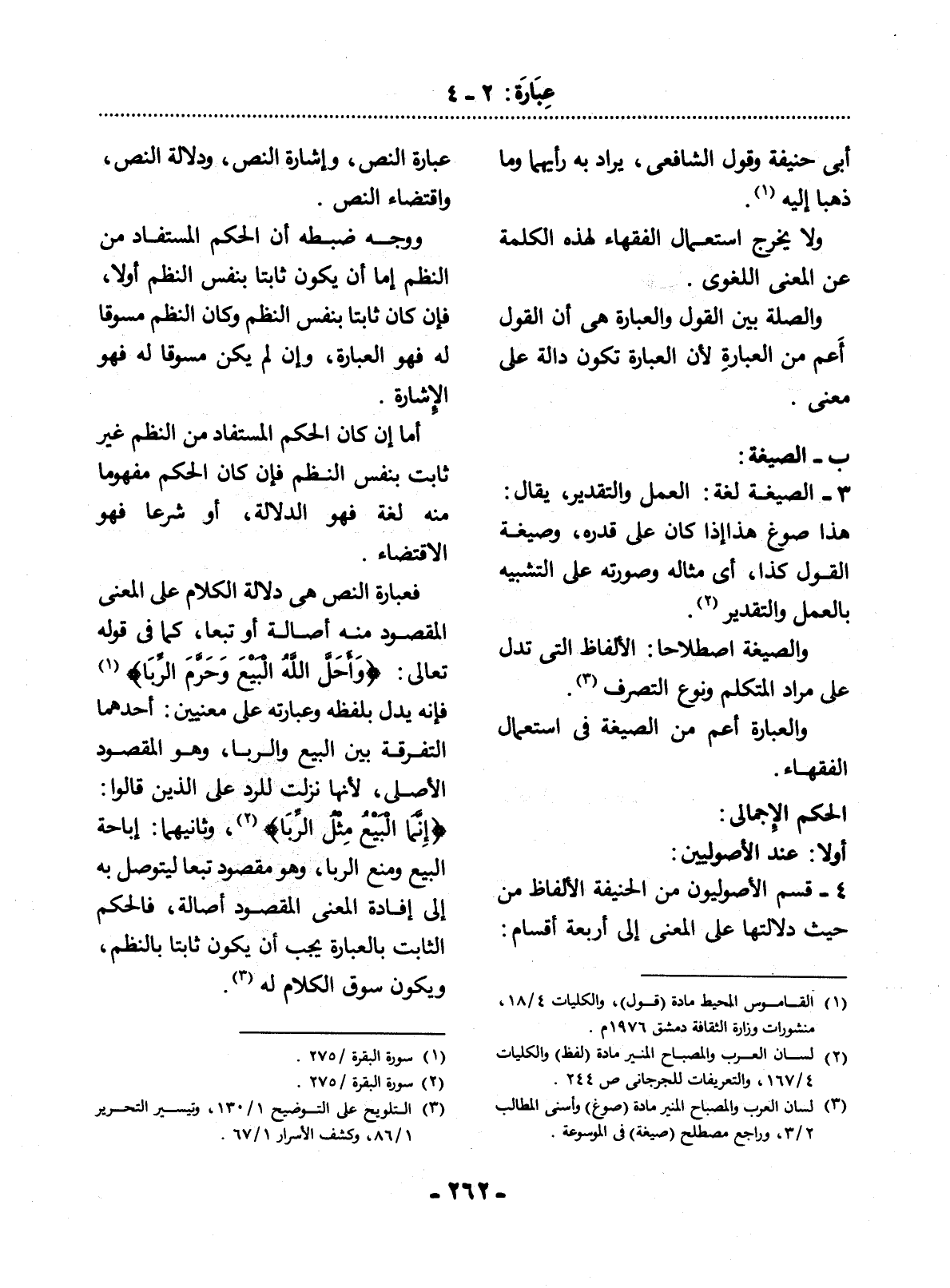 فَعِبَارَةُ النَّصِّ هِيَ دَلاَلَةُ الْكَلاَمِ عَلَى الْمَعْنَى الْمَقْصُودِ مِنْهُ أَصَالَةً أَوْ تَبَعًا، كَمَا فِي قَوْله تَعَالَى: {وَأَحَل اللَّهُ الْبَيْعَ وَحَرَّمَ الرِّبَا} (1) فَإِنَّهُ يَدُل بِلَفْظِهِ وَعِبَارَتِهِ عَلَى مَعْنَيَيْنِ: أَحَدُهُمَا التَّفْرِقَةُ بَيْنَ الْبَيْعِ وَالرِّبَا، وَهُوَ الْمَقْصُودُ الأَْصْلِيُّ، لأَِنَّهَا نَزَلَتْ لِلرَّدِّ عَلَى الَّذِينَ قَالُوا: {إِنَّمَا الْبَيْعُ مِثْل الرِّبَا} (2) ، وَثَانِيهُمَا: إِبَاحَةُ الْبَيْعِ وَمَنْعُ الرِّبَا، وَهُوَ مَقْصُودٌ تَبَعًا لِيُتَوَصَّل بِهِ إِلَى إِفَادَةِ الْمَعْنَى الْمَقْصُودِ أَصَالَةً، فَالْحُكْمُ الثَّابِتُ بِالْعِبَارَةِ يَجِبُ أَنْ يَكُونَ ثَابِتًا بِالنَّظْمِ، وَيَكُونُ سَوْقُ الْكَلاَمِ لَهُ (3) .