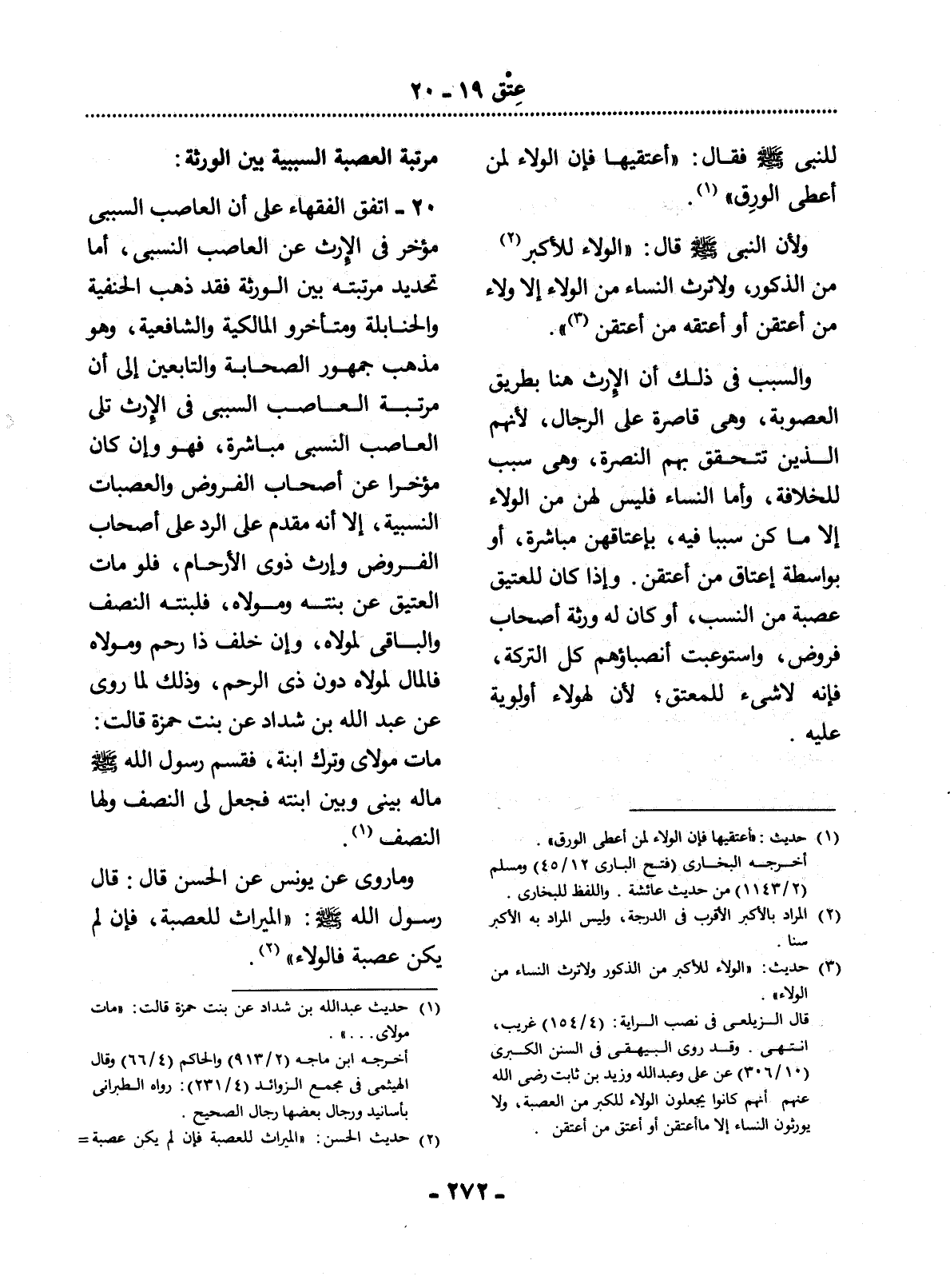 20 - اتَّفَقَ الْفُقَهَاءُ عَلَى أَنَّ الْعَاصِبَ السَّبَبِيَّ مُؤَخَّرٌ فِي الإِْرْثِ عَنِ الْعَاصِبِ النَّسَبِيِّ، أَمَّا تَحْدِيدُ مَرْتَبَتِهِ بَيْنَ الْوَرَثَةِ فَقَدْ ذَهَبَ الْحَنَفِيَّةُ وَالْحَنَابِلَةُ وَمُتَأَخِّرُو الْمَالِكِيَّةِ وَالشَّافِعِيَّةِ، وَهُوَ مَذْهَبُ جُمْهُورِ الصَّحَابَةِ وَالتَّابِعِينَ إِلَى أَنَّ مَرْتَبَةَ الْعَاصِبِ السَّبَبِيِّ فِي الإِْرْثِ تَلِي الْعَاصِبَ النَّسَبِيَّ مُبَاشَرَةً، فَهُوَ وَإِنْ كَانَ مُؤَخَّرًا عَنْ أَصْحَابِ الْفُرُوضِ وَالْعَصَبَاتِ النَّسَبِيَّةِ، إِلاَّ أَنَّهُ مُقَدَّمٌ عَلَى الرَّدِّ عَلَى أَصْحَابِ الْفُرُوضِ وَإِرْثِ ذَوِي الأَْرْحَامِ، فَلَوْ مَاتَ الْعَتِيقُ عَنْ بِنْتِهِ وَمَوْلاَهُ، فَلِبِنْتِهِ النِّصْفُ وَالْبَاقِي لِمَوْلاَهُ، وَإِنْ خَلَّفَ ذَا رَحِمٍ وَمَوْلاَهُ فَالْمَال لِمَوْلاَهُ دُونَ ذِي الرَّحِمِ، وَذَلِكَ لِمَا رُوِيَ عَنْ عَبْدِ اللَّهِ بْنِ شَدَّادٍ عَنْ بِنْتِ حَمْزَةَ قَالَتْ: مَاتَ مَوْلاَيَ وَتَرَكَ ابْنَةً، فَقَسَمَ رَسُول اللَّهِ صَلَّى اللَّهُ عَلَيْهِ وَسَلَّمَ مَالَهُ بَيْنِي وَبَيْنَ ابْنَتِهِ فَجَعَل لِي النِّصْفَ وَلَهَا النِّصْفَ (1) .
