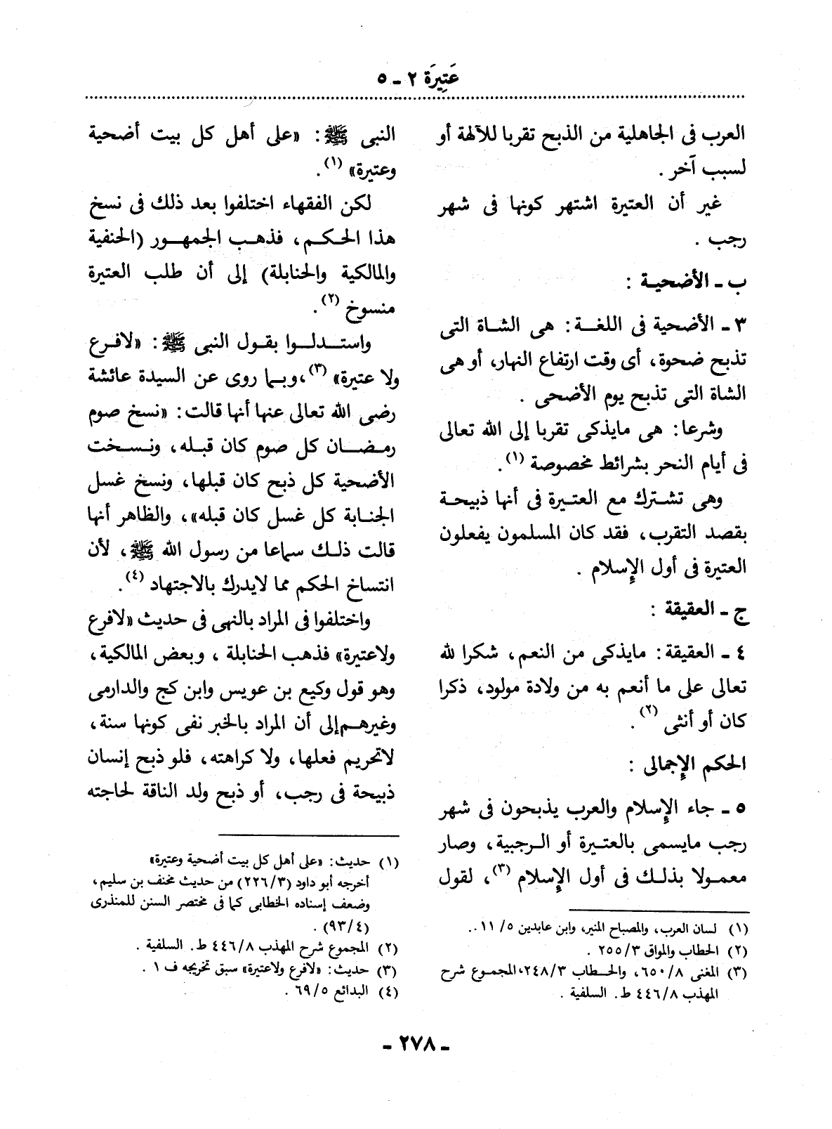 5 - جَاءَ الإِْسْلاَمُ وَالْعَرَبُ يَذْبَحُونَ فِي شَهْرِ رَجَبٍ مَا يُسَمَّى بِالْعَتِيرَةِ أَوِ الرَّجَبِيَّةِ، وَصَارَ مَعْمُولاً بِذَلِكَ فِي أَوَّل الإِْسْلاَمِ (3) ، لِقَوْل