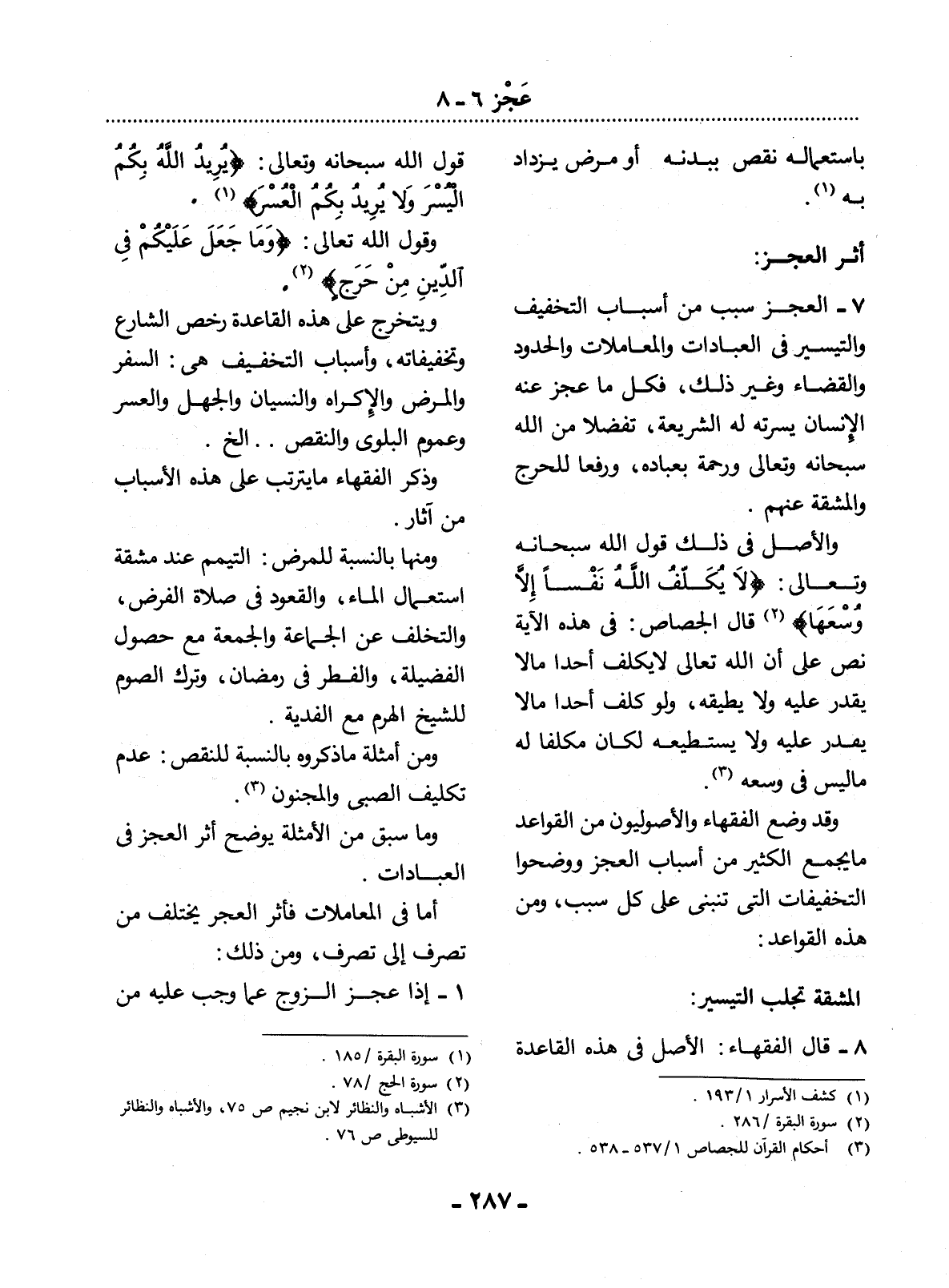 وَقَدْ وَضَعَ الْفُقَهَاءُ وَالأُْصُولِيُّونَ مِنَ الْقَوَاعِدِ مَا يَجْمَعُ الْكَثِيرَ مِنْ أَسْبَابِ الْعَجْزِ وَوَضَّحُوا التَّخْفِيفَاتِ الَّتِي تَنْبَنِي عَلَى كُل سَبَبٍ، وَمِنْ هَذِهِ الْقَوَاعِدِ: