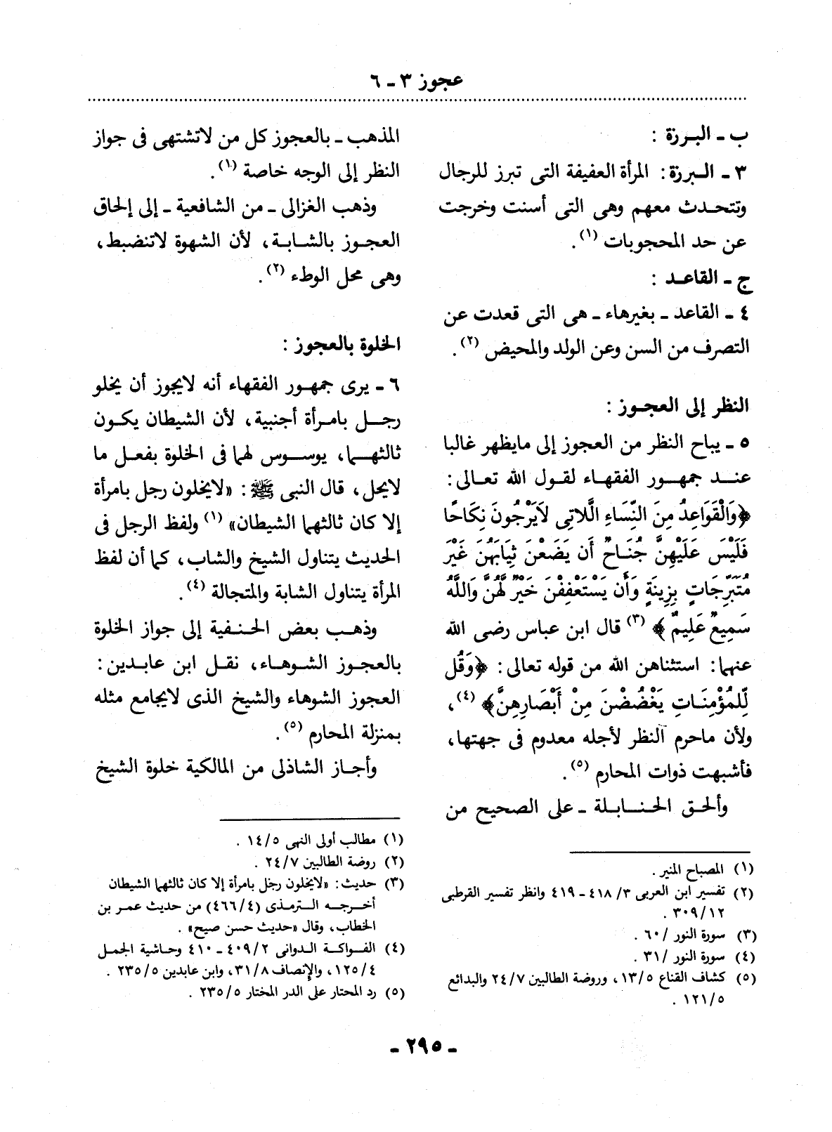 5 - يُبَاحُ النَّظَرُ مِنَ الْعَجُوزِ إِلَى مَا يَظْهَرُ غَالِبًا. عِنْدَ جُمْهُورِ الْفُقَهَاءِ لِقَوْل اللَّهِ تَعَالَى: {وَالْقَوَاعِدُ مِنَ النِّسَاءِ اللاَّتِي لاَ يَرْجُونَ نِكَاحًا فَلَيْسَ عَلَيْهِنَّ جُنَاحٌ أَنْ يَضَعْنَ ثِيَابَهُنَّ غَيْرَ مُتَبَرِّجَاتٍ بِزِينَةٍ وَأَنْ يَسْتَعْفِفْنَ خَيْرٌ لَهُنَّ وَاَللَّهُ سَمِيعٌ عَلِيمٌ} (3) قَال ابْنُ عَبَّاسٍ رَضِيَ اللَّهُ عَنْهُمَا: اسْتَثْنَاهُنَّ اللَّهُ مِنْ قَوْله تَعَالَى: {وَقُل لِلْمُؤْمِنَاتِ يَغْضُضْنَ مِنْ أَبْصَارِهِنَّ} (4) ، وَلأَِنَّ مَا حَرُمَ النَّظَرُ لأَِجْلِهِ مَعْدُومٌ فِي جِهَتِهَا، فَأَشْبَهَتْ ذَوَاتَ الْمَحَارِمِ (5) .
