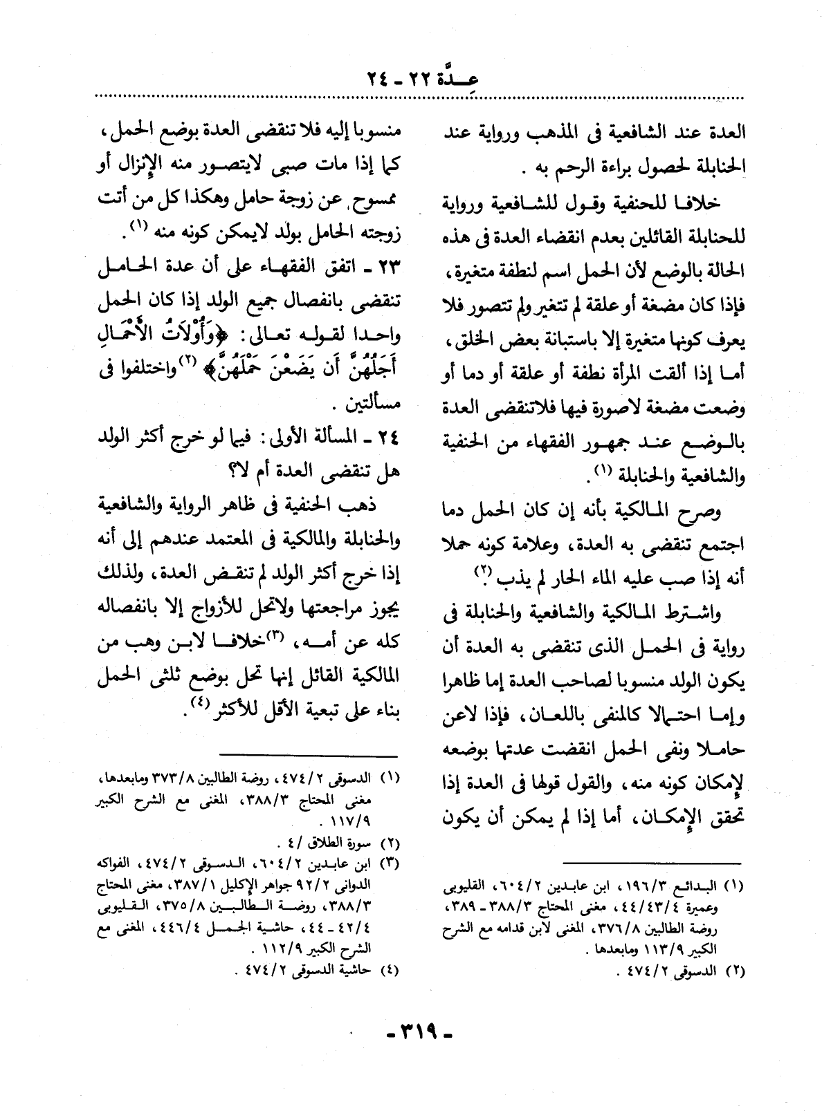 23 - اتَّفَقَ الْفُقَهَاءُ عَلَى أَنَّ عِدَّةَ الْحَامِل تَنْقَضِي بِانْفِصَال جَمِيعِ الْوَلَدِ إِذَا كَانَ الْحَمْل وَاحِدًا لِقَوْلِهِ تَعَالَى: {وَأُولاَتُ الأَْحْمَال أَجَلُهُنَّ أَنْ يَضَعْنَ حَمْلَهُنَّ} (2) وَاخْتَلَفُوا فِي مَسْأَلَتَيْنِ.