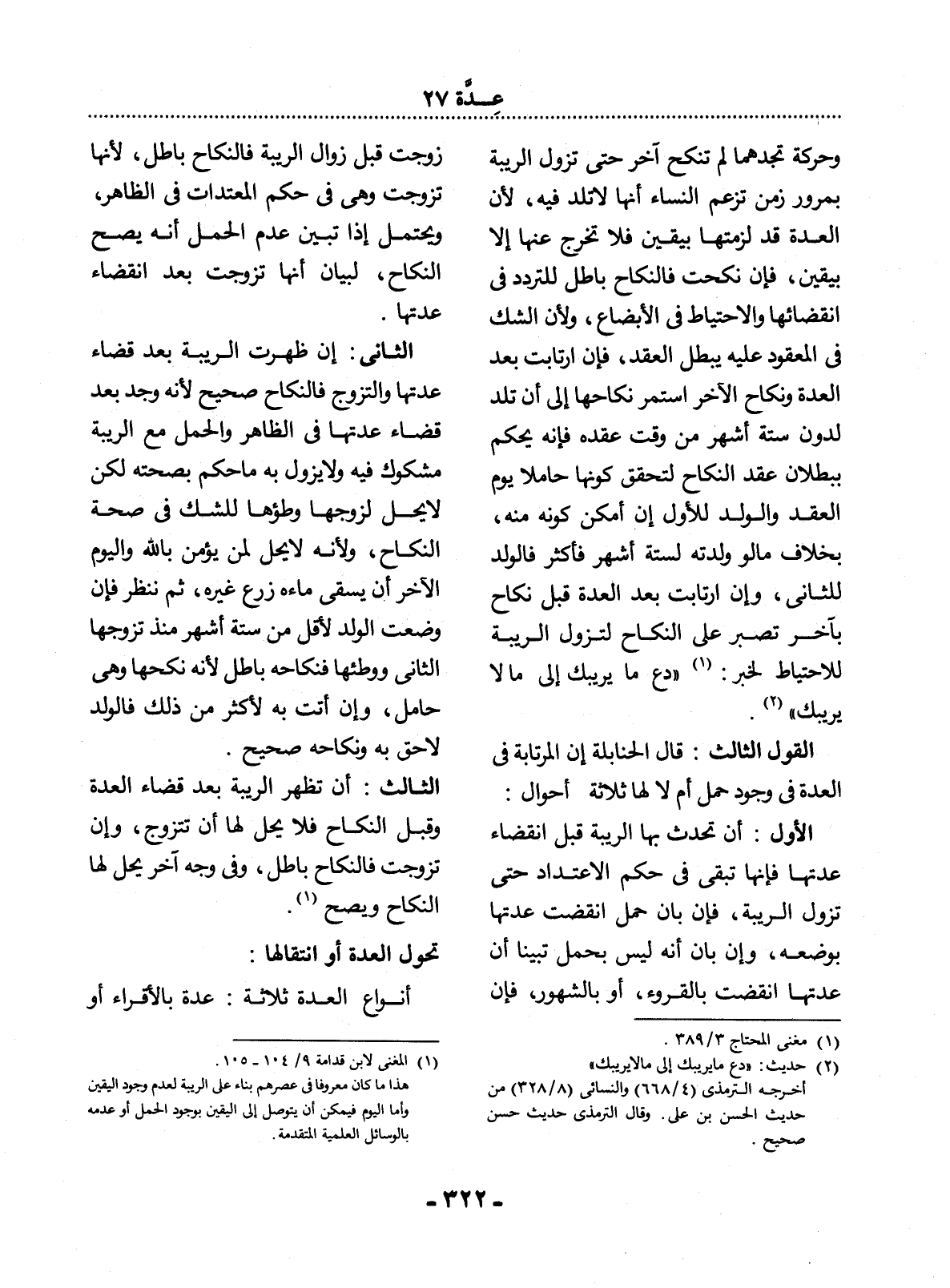 (1) (1) المغني لابن قدامة 9 / 104 - 105. هذا ما كان معروفا في عصرهم بناء على الريبة لعدم وجود اليقين وأما اليوم فيمكن أن يتوصل إلى اليقين بوجود الحمل أو عدمه بالوسائل العلمية المتقدمة.