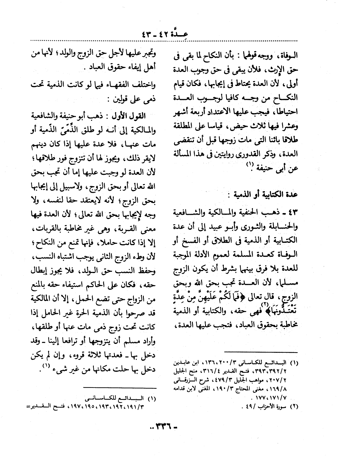 43 - ذَهَبَ الْحَنَفِيَّةُ وَالْمَالِكِيَّةُ وَالشَّافِعِيَّةُ وَالْحَنَابِلَةُ وَالثَّوْرِيُّ وَأَبُو عُبَيْدٍ إِلَى أَنَّ عِدَّةَ الْكِتَابِيَّةِ أَوِ الذِّمِّيَّةِ فِي الطَّلاَقِ أَوِ الْفَسْخِ أَوِ الْوَفَاةِ كَعِدَّةِ الْمُسْلِمَةِ لِعُمُومِ الأَْدِلَّةِ الْمُوجِبَةِ لِلْعِدَّةِ بِلاَ فَرْقٍ بَيْنَهُمَا بِشَرْطِ أَنْ يَكُونَ الزَّوْجُ مُسْلِمًا، لأَِنَّ الْعِدَّةَ تَجِبُ بِحَقِّ اللَّهِ وَبِحَقِّ الزَّوْجِ، قَال تَعَالَى {فَمَا لَكُمْ عَلَيْهِنَّ مِنْ عِدَّةٍ تَعْتَدُّونَهَا} (2) فَهِيَ حَقُّهُ، وَالْكِتَابِيَّةُ أَوِ الذِّمِّيَّةُ مُخَاطَبَةٌ بِحُقُوقِ الْعِبَادِ، فَتَجِبُ عَلَيْهَا الْعِدَّةُ،