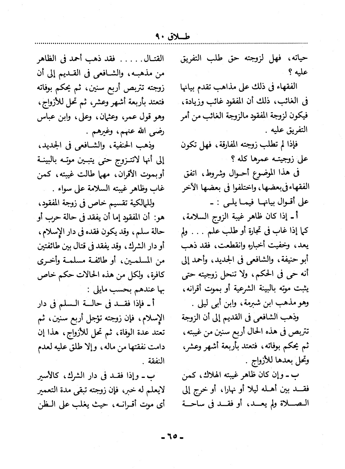 الْقِتَال. . . فَقَدْ ذَهَبَ أَحْمَدُ فِي الظَّاهِرِ مِنْ مَذْهَبِهِ، وَالشَّافِعِيُّ فِي الْقَدِيمِ إِلَى أَنَّ زَوْجَتَهُ تَتَرَبَّصُ أَرْبَعَ سِنِينَ، ثُمَّ يُحْكَمُ بِوَفَاتِهِ فَتَعْتَدُّ بِأَرْبَعَةِ أَشْهُرٍ وَعَشْرٍ، ثُمَّ تَحِل لِلأَْزْوَاجِ، وَهُوَ قَوْل عُمَرَ، وَعُثْمَانَ، وَعَلِيٍّ، وَابْنِ عَبَّاسٍ رَضِيَ اللَّهُ عَنْهُمْ، وَغَيْرِهِمْ.