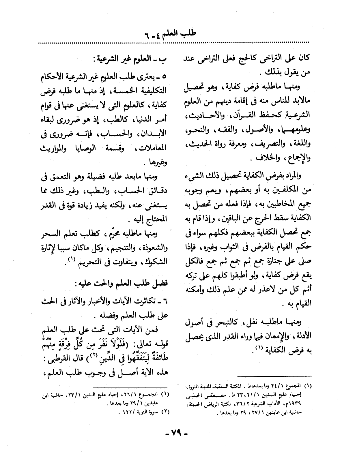 وَمِنْهَا مَا طَلَبُهُ فَرْضُ كِفَايَةٍ، وَهُوَ تَحْصِيل مَا لاَ بُدَّ لِلنَّاسِ مِنْهُ فِي إِقَامَةِ دِينِهِمْ مِنَ الْعُلُومِ الشَّرْعِيَّةِ كَحِفْظِ الْقُرْآنِ، وَالأَْحَادِيثِ، وَعُلُومِهِمَا، وَالأُْصُول، وَالْفِقْهِ، وَالنَّحْوِ، وَاللُّغَةِ، وَالتَّصْرِيفِ، وَمَعْرِفَةِ رُوَاةِ الْحَدِيثِ، وَالإِْجْمَاعِ، وَالْخِلاَفِ.