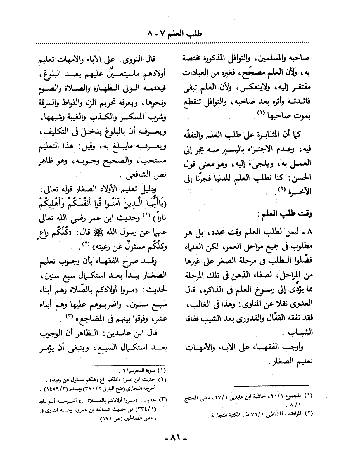 8 - لَيْسَ لِطَلَبِ الْعِلْمِ وَقْتٌ مُحَدَّدٌ، بَل هُوَ مَطْلُوبٌ فِي جَمِيعِ مَرَاحِل الْعُمْرِ، لَكِنَّ الْعُلَمَاءَ فَضَّلُوا الطَّلَبَ فِي مَرْحَلَةِ الصِّغَرِ عَلَى غَيْرِهَا مِنَ الْمَرَاحِل، لِصَفَاءِ الذِّهْنِ فِي تِلْكَ الْمَرْحَلَةِ مِمَّا يُؤَدِّي إِلَى رُسُوخِ الْعِلْمِ فِي الذَّاكِرَةِ، قَال الْعَدَوِيُّ نَقْلاً عَنِ الْمُنَاوِيِّ: وَهَذَا فِي الْغَالِبِ، فَقَدْ تَفَقَّهَ الْقَفَّال وَالْقُدُورِيُّ بَعْدَ الشَّيْبِ فَفَاقَا الشَّبَابَ.