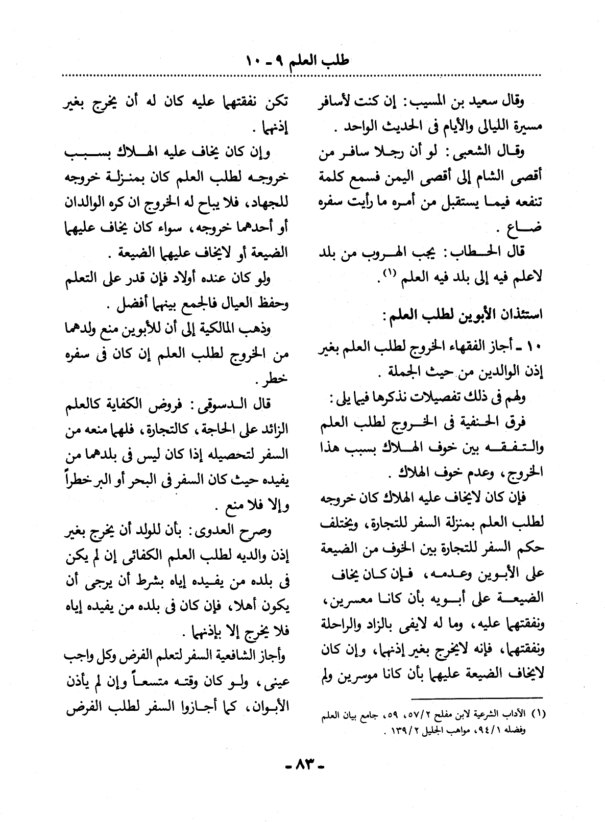 10 - أَجَازَ الْفُقَهَاءُ الْخُرُوجَ لِطَلَبِ الْعِلْمِ بِغَيْرِ إِذْنِ الْوَالِدَيْنِ مِنْ حَيْثُ الْجُمْلَةُ.