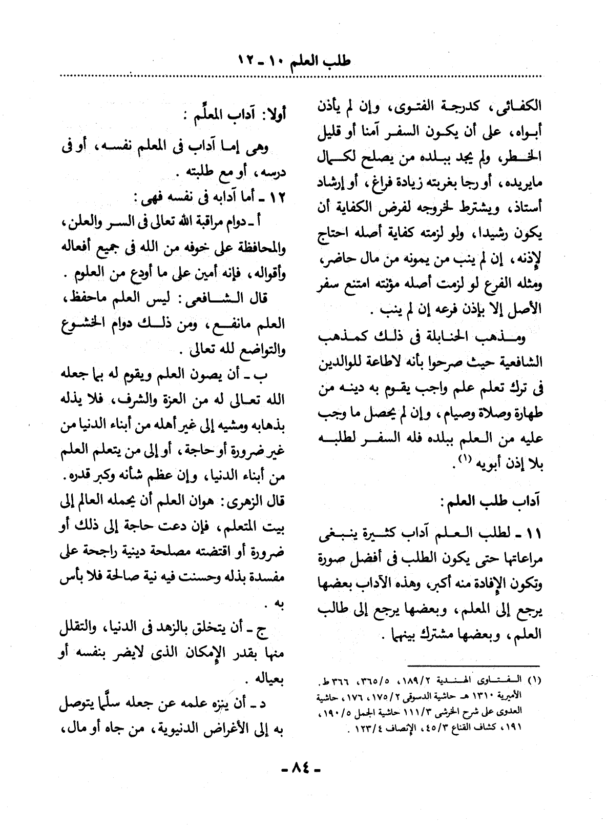 11 - لِطَلَبِ الْعِلْمِ آدَابٌ كَثِيرَةٌ يَنْبَغِي مُرَاعَاتُهَا حَتَّى يَكُونَ الطَّلَبُ فِي أَفْضَل صُورَةٍ وَتَكُونُ الإِْفَادَةُ مِنْهُ أَكْبَرَ، وَهَذِهِ الآْدَابُ بَعْضُهَا يَرْجِعُ إِلَى الْمُعَلِّمِ، وَبَعْضُهَا يَرْجِعُ إِلَى طَالِبِ الْعِلْمِ، وَبَعْضُهَا مُشْتَرَكٌ بَيْنَهُمَا.