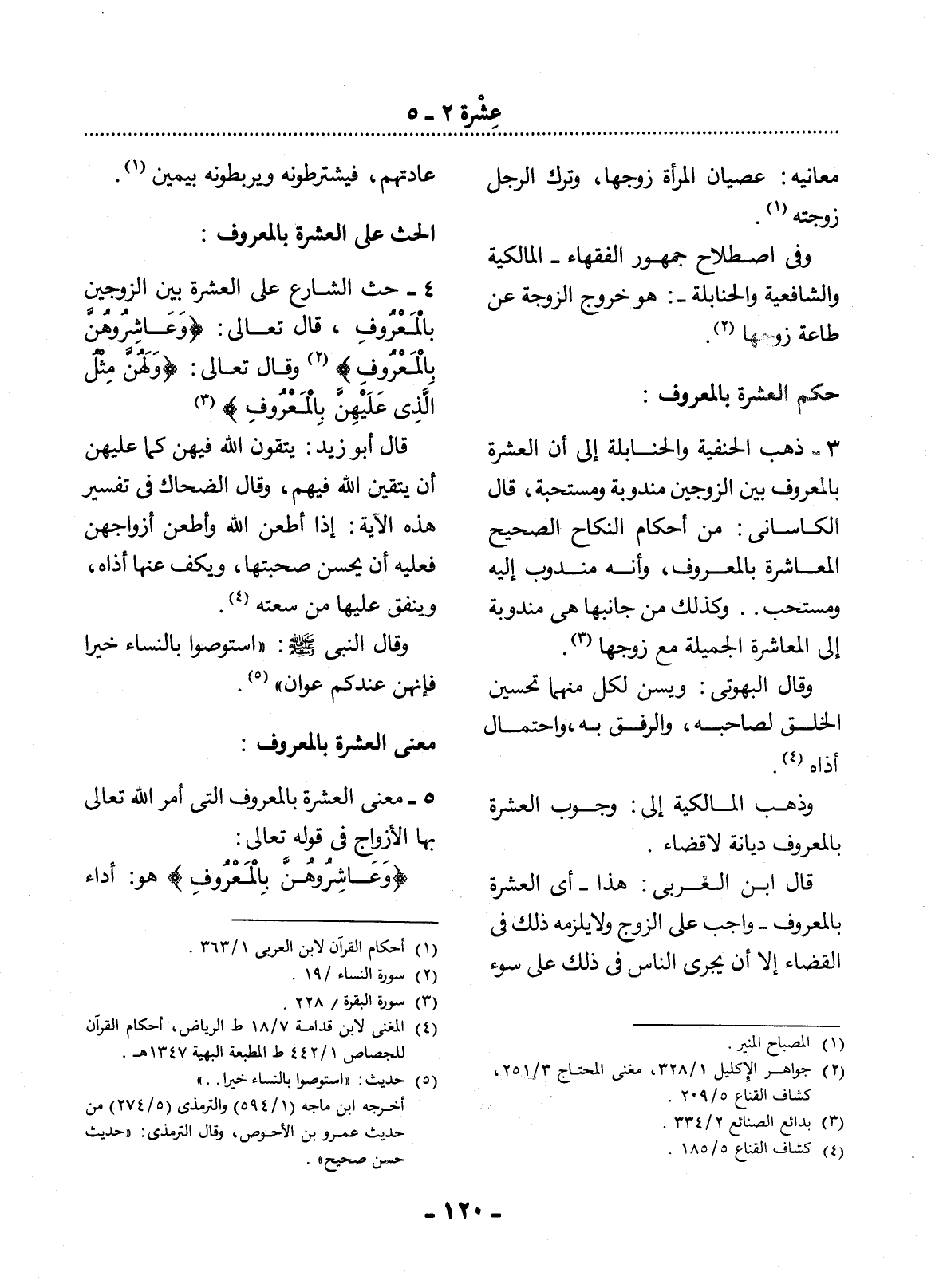 4 - حَثَّ الشَّارِعُ عَلَى الْعِشْرَةِ بَيْنَ الزَّوْجَيْنِ بِالْمَعْرُوفِ، قَال تَعَالَى: {وَعَاشِرُوهُنَّ بِالْمَعْرُوفِ} (2) وَقَال تَعَالَى: {وَلَهُنَّ مِثْل الَّذِي عَلَيْهِنَّ بِالْمَعْرُوفِ}