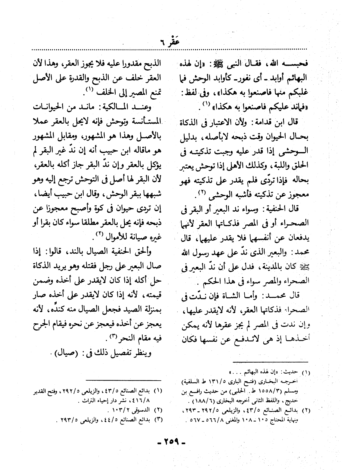 قَال الْحَنَفِيَّةُ: وَسَوَاءٌ نَدَّ الْبَعِيرُ أَوِ الْبَقَرُ فِي الصَّحْرَاءِ أَوْ فِي الْمِصْرِ فَذَكَاتُهَا الْعَقْرُ؛ لأَِنَّهُمَا يَدْفَعَانِ عَنْ أَنْفُسِهِمَا فَلاَ يَقْدِرُ عَلَيْهِمَا، قَال مُحَمَّدٌ: وَالْبَعِيرُ الَّذِي نَدَّ عَلَى عَهْدِ رَسُول اللَّهِ صَلَّى اللَّهُ عَلَيْهِ وَسَلَّمَ كَانَ بِالْمَدِينَةِ، فَدَل عَلَى أَنَّ نَدَّ الْبَعِيرِ فِي الصَّحْرَاءِ وَالْمِصْرِ سَوَاءٌ فِي هَذَا الْحُكْمِ.