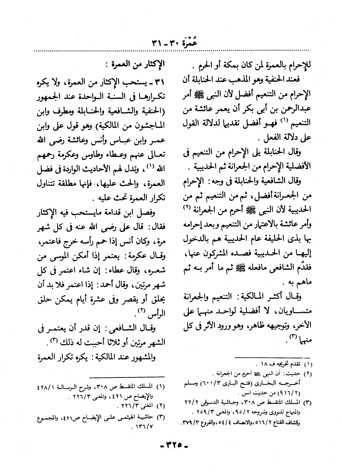 31 - يُسْتَحَبُّ الإِْكْثَارُ مِنَ الْعُمْرَةِ، وَلاَ يُكْرَهُ تَكْرَارُهَا فِي السَّنَةِ الْوَاحِدَةِ عِنْدَ الْجُمْهُورِ (الْحَنَفِيَّةِ وَالشَّافِعِيَّةِ وَالْحَنَابِلَةِ وَمُطَرِّفٍ وَابْنِ الْمَاجِشُونِ مِنَ الْمَالِكِيَّةِ) وَهُوَ قَوْل عَلِيٍّ وَابْنِ عُمَرَ وَابْنِ عَبَّاسٍ وَأَنَسٍ وَعَائِشَةَ رَضِيَ اللَّهُ تَعَالَى عَنْهُمْ وَعَطَاءٍ وَطَاوُسٍ وَعِكْرِمَةَ رَحِمَهُمُ اللَّهُ (1) ، وَتَدُل لَهُمُ الأَْحَادِيثُ الْوَارِدَةُ فِي فَضْل الْعُمْرَةِ، وَالْحَثِّ عَلَيْهَا، فَإِنَّهَا مُطْلَقَةٌ تَتَنَاوَل تَكْرَارَ الْعُمْرَةِ تَحُثُّ عَلَيْهِ.