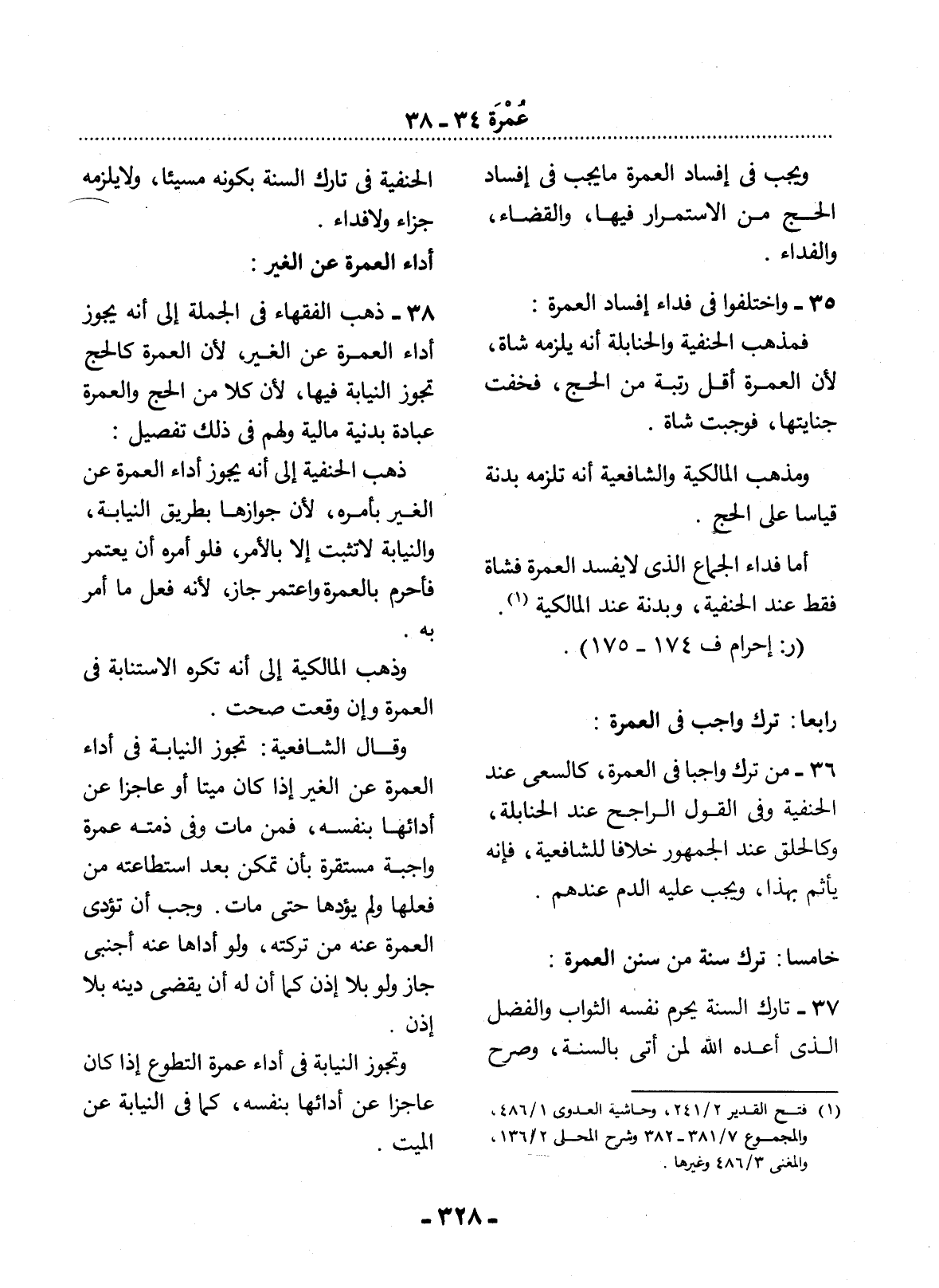 36 - مَنْ تَرَكَ وَاجِبًا فِي الْعُمْرَةِ، كَالسَّعْيِ عِنْدَ الْحَنَفِيَّةِ وَفِي الْقَوْل الرَّاجِحِ عِنْدَ الْحَنَابِلَةِ، وَكَالْحَلْقِ عِنْدَ الْجُمْهُورِ خِلاَفًا لِلشَّافِعِيَّةِ، فَإِنَّهُ يَأْثَمُ بِهَذَا، وَيَجِبُ عَلَيْهِ الدَّمُ عِنْدَهُمْ