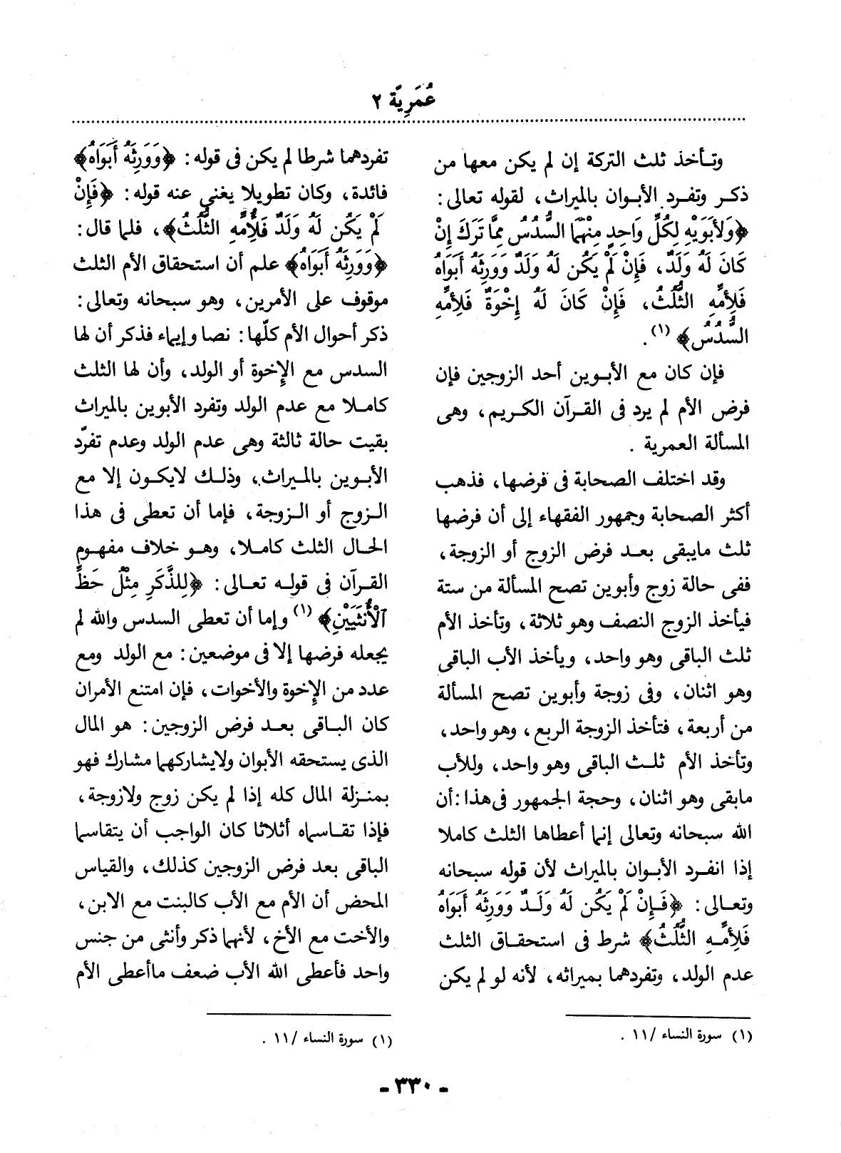 فَإِنْ كَانَ مَعَ الأَْبَوَيْنِ أَحَدُ الزَّوْجَيْنِ فَإِنَّ فَرْضَ الأُْمِّ لَمْ يَرِدْ فِي الْقُرْآنِ الْكَرِيمِ، وَهِيَ الْمَسْأَلَةُ الْعُمَرِيَّةُ.