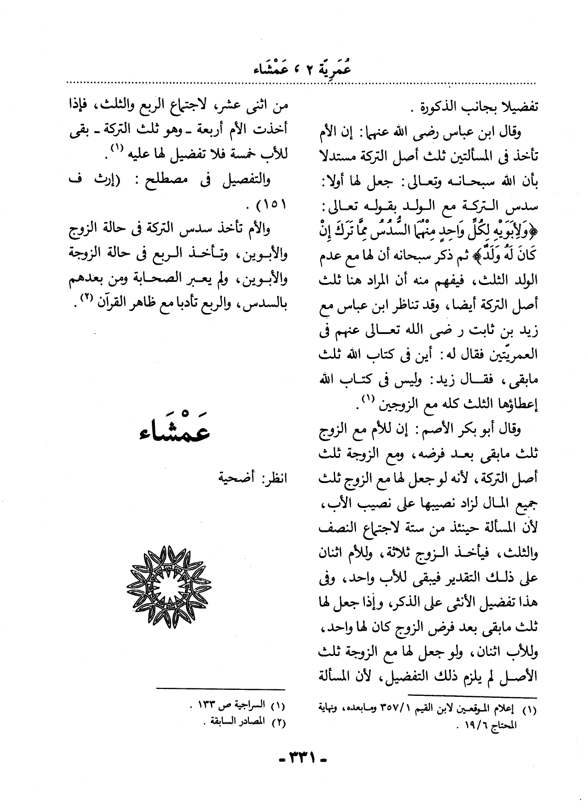 وَقَال ابْنُ عَبَّاسٍ رَضِيَ اللَّهُ عَنْهُمَا: إِنَّ الأُْمَّ تَأْخُذُ فِي الْمَسْأَلَتَيْنِ ثُلُثَ أَصْل التَّرِكَةِ مُسْتَدِلًّا بِأَنَّ اللَّهَ سُبْحَانَهُ وَتَعَالَى: جَعَل لَهَا أَوَّلاً: سُدُسَ التَّرِكَةِ مَعَ الْوَلَدِ بِقَوْلِهِ تَعَالَى: {وَلأَِبَوَيْهِ لِكُل وَاحِدٍ مِنْهُمَا السُّدُسُ مِمَّا تَرَكَ إِنْ كَانَ لَهُ وَلَدٌ} ثُمَّ ذَكَرَ سُبْحَانَهُ أَنَّ لَهَا مَعَ عَدَمِ الْوَلَدِ الثُّلُثَ، فَيُفْهَمُ مِنْهُ أَنَّ الْمُرَادَ هُنَا ثُلُثُ أَصْل التَّرِكَةِ أَيْضًا، وَقَدْ تَنَاظَرَ ابْنُ عَبَّاسٍ مَعَ زَيْدِ بْنِ ثَابِتٍ رَضِيَ اللَّهُ تَعَالَى عَنْهُمْ فِي الْعُمَرِيَّتَيْنِ فَقَال لَهُ: أَيْنَ فِي كِتَابِ اللَّهِ ثُلُثُ مَا بَقِيَ، فَقَال زَيْدٌ: وَلَيْسَ فِي كِتَابِ اللَّهِ إِعْطَاؤُهَا الثُّلُثَ كُلَّهُ مَعَ الزَّوْجَيْنِ (1) .