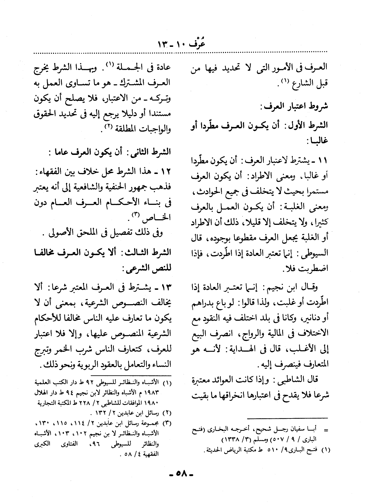 13 - يُشْتَرَطُ فِي الْعُرْفِ الْمُعْتَبَرِ شَرْعًا: أَلاَّ يُخَالِفَ النُّصُوصَ الشَّرْعِيَّةَ، بِمَعْنَى أَنْ لاَ يَكُونَ مَا تَعَارَفَ عَلَيْهِ النَّاسُ مُخَالِفًا لِلأَْحْكَامِ الشَّرْعِيَّةِ الْمَنْصُوصِ عَلَيْهَا، وَإِلاَّ فَلاَ اعْتِبَارَ لِلْعُرْفِ، كَتَعَارُفِ النَّاسِ شُرْبَ الْخَمْرِ وَتَبَرُّجَ النِّسَاءِ وَالتَّعَامُل بِالْعُقُودِ الرِّبَوِيَّةِ وَنَحْوَ ذَلِكَ