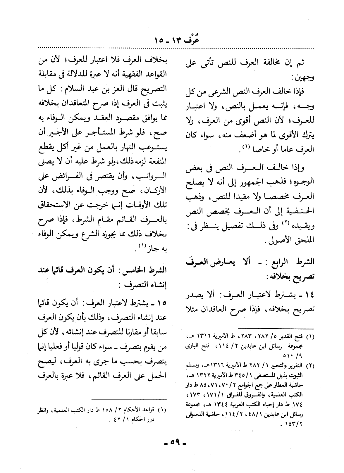 (2) التقرير والتحبير 1 / 282 ط الأميرية 1316هـ، ومسلم الثبوت بذيل المستصفي 1 / 345 ط الأميرية 1322هـ، حاشية العطار على جمع الجوامع 2 / 70، 71، 84 ط دار الكتب العلمية، والفروق للقرافي 1 / 171، 173، 174 ط دار إحياء الكتب العربية 1344هـ، مجموعة رسائل ابن عابدين 1 / 48، 2 / 114، حاشية الدسوقي 2 / 143.