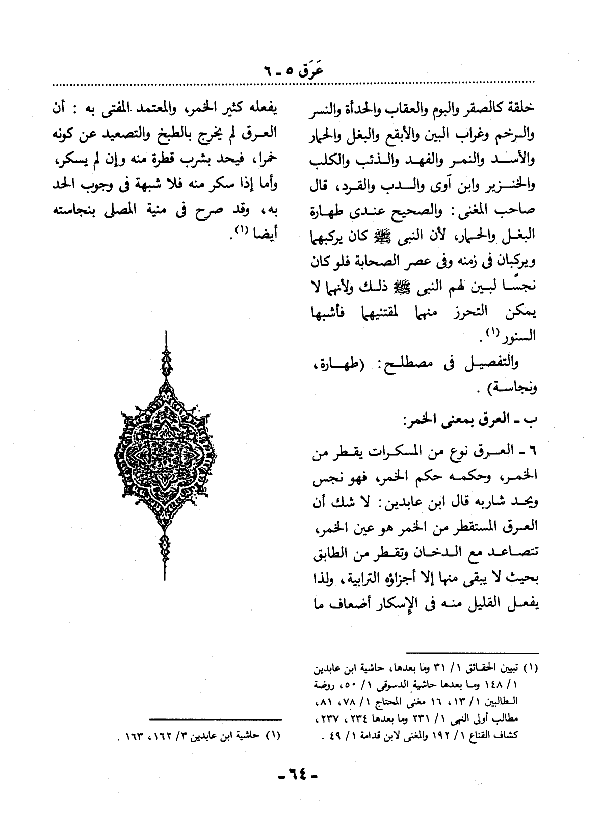 يَفْعَلُهُ كَثِيرُ الْخَمْرِ، وَالْمُعْتَمَدُ الْمُفْتَى بِهِ: أَنَّ الْعَرَقَ لَمْ يَخْرُجْ بِالطَّبْخِ وَالتَّصْعِيدِ عَنْ كَوْنِهِ خَمْرًا، فَيُحَدُّ بِشُرْبِ قَطْرَةٍ مِنْهُ وَإِنْ لَمْ يَسْكَرْ، وَأَمَّا إِذَا سَكِرَ مِنْهُ فَلاَ شُبْهَةَ فِي وُجُوبِ الْحَدِّ بِهِ، وَقَدْ صَرَّحَ فِي مُنْيَةِ الْمُصَلِّي بِنَجَاسَتِهِ أَيْضًا (1) .