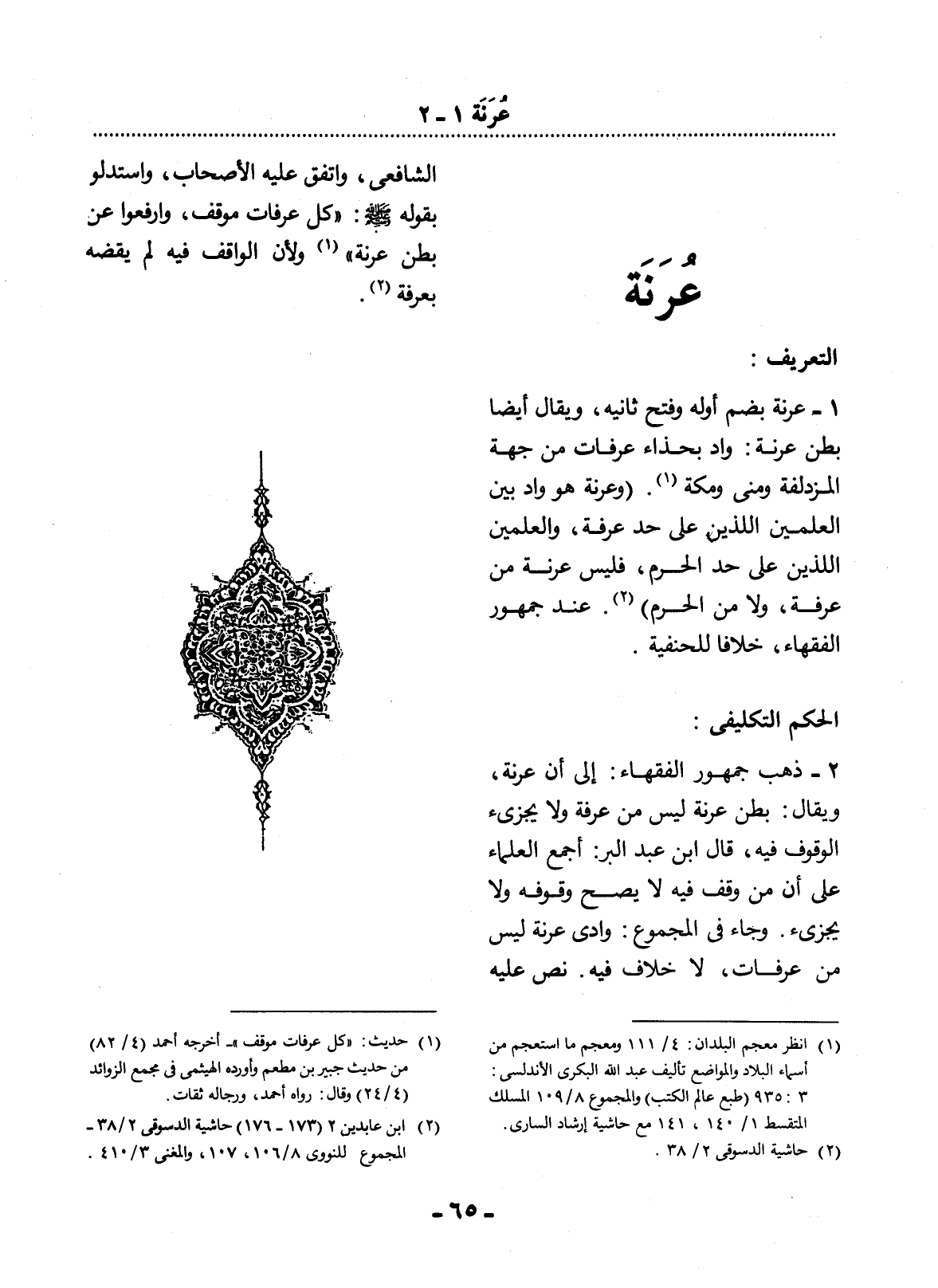 1 - عُرَنَةُ بِضَمِّ أَوَّلِهِ وَفَتْحِ ثَانِيهِ، وَيُقَال أَيْضًا بَطْنُ عُرَنَةَ: وَادٍ بِحِذَاءِ عَرَفَاتٍ مِنْ جِهَةِ الْمُزْدَلِفَةِ وَمِنًى وَمَكَّةَ (1) . (وَعُرَنَةُ هُوَ وَادٍ بَيْنَ الْعَلَمَيْنِ اللَّذَيْنِ عَلَى حَدِّ عَرَفَةَ، وَالْعَلَمَيْنِ اللَّذَيْنِ عَلَى حَدِّ الْحَرَمِ، فَلَيْسَ عُرَنَةُ مِنْ عَرَفَةَ، وَلاَ مِنَ الْحَرَمِ (2)) . عِنْدَ جُمْهُورِ الْفُقَهَاءِ، خِلاَفًا لِلْحَنَفِيَّةِ.