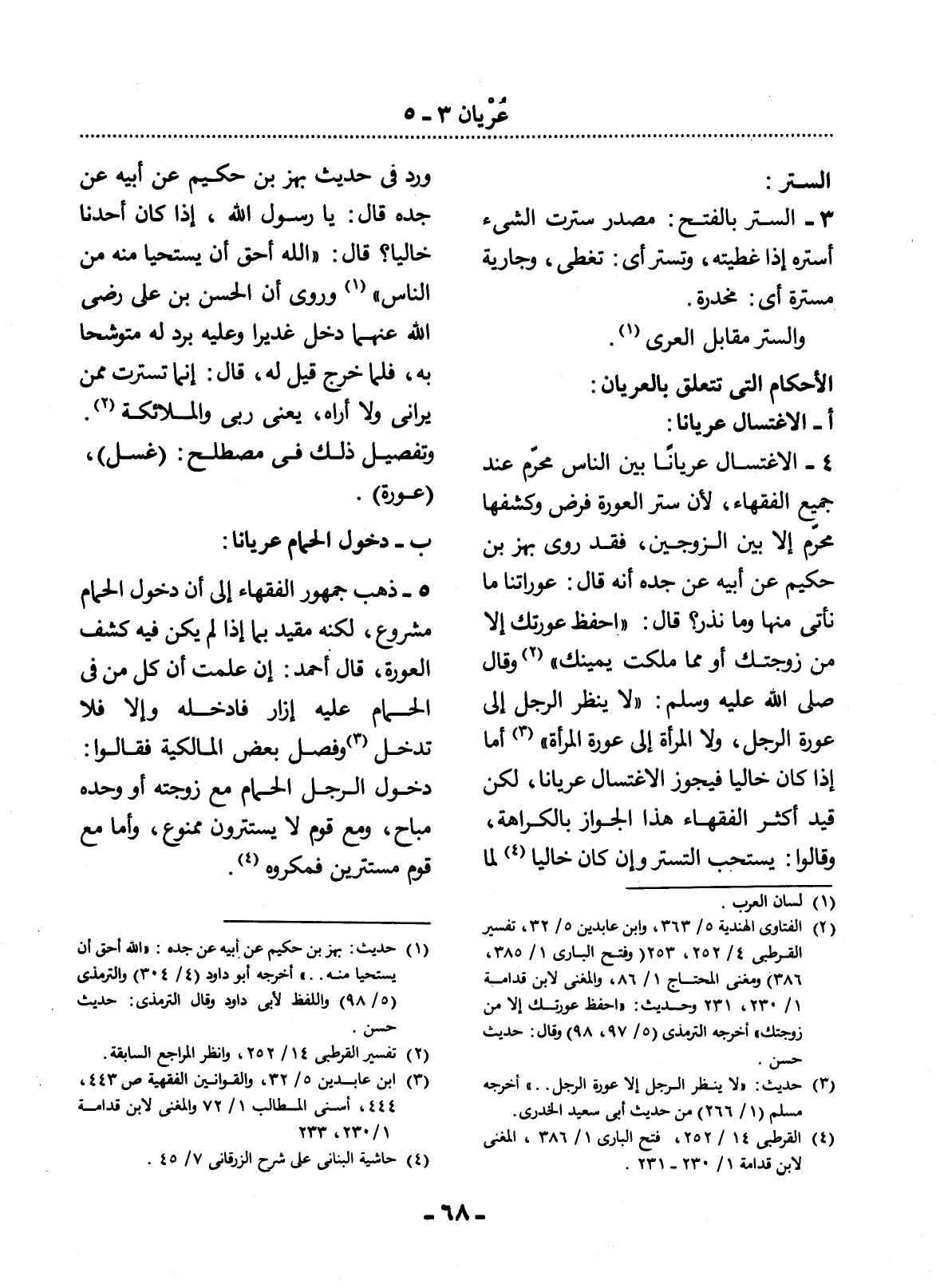 (2) الفتاوى الهندية 5 / 363، وابن عابدين 5 / 32، تفسير القرطبي 4 / 252، 253 (وفتح الباري 1 / 385، 386) ، ومغني المحتاج 1 / 86، والمغني لابن قدامة 1 / 230، 231، وحديث: " احفظ عورتك إلا من زوجتك " أخرجه الترمذي (5 / 97، 98) وقال: حديث حسن.