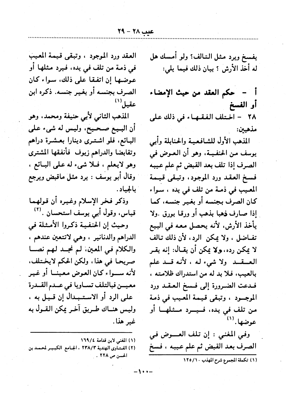 الْعَقْدُ وَرَدَّ الْمَوْجُودَ، وَتَبْقَى قِيمَةُ الْمَعِيبِ فِي ذِمَّةِ مَنْ تَلِفَ فِي يَدِهِ. فَيَرُدُّ مِثْلَهَا أَوْ عِوَضَهَا إِنِ اتَّفَقَا عَلَى ذَلِكَ، سَوَاءٌ كَانَ الصَّرْفُ بِجِنْسِهِ أَوْ بِغَيْرِ جِنْسِهِ. ذَكَرَهُ ابْنُ عَقِيلٍ (1)
