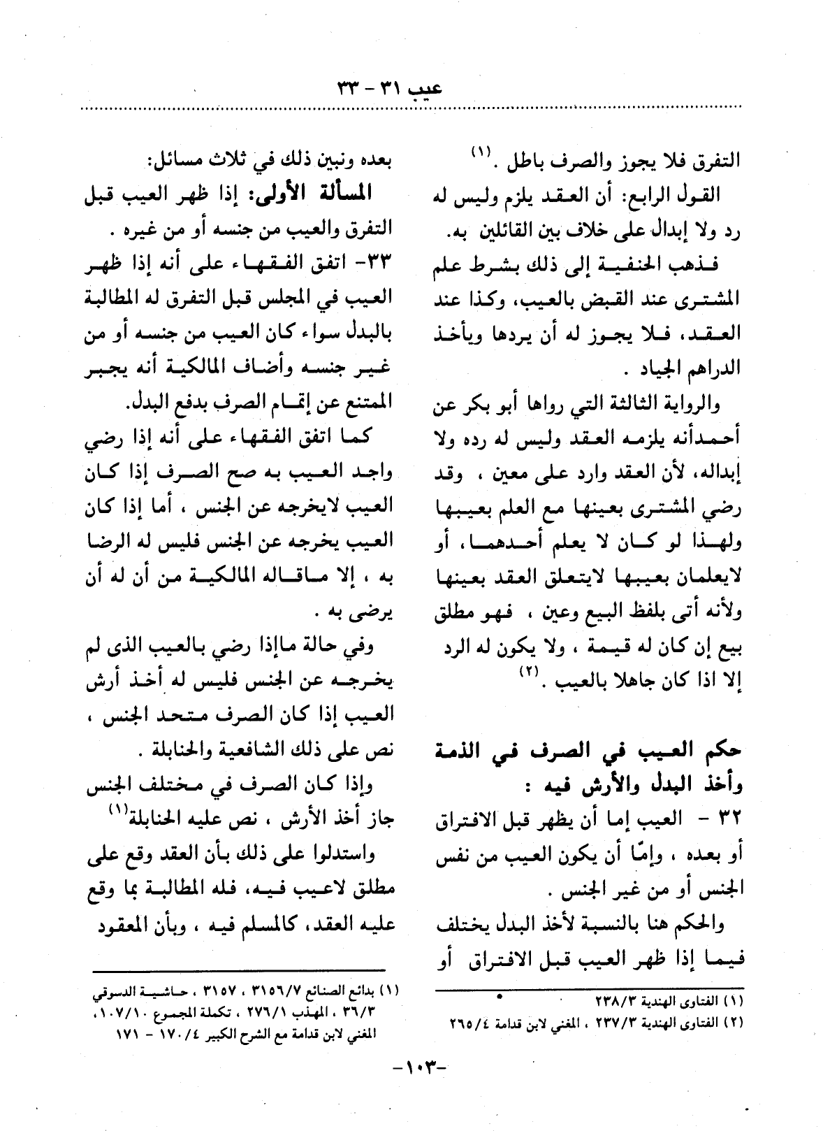 32 - الْعَيْبُ إِمَّا أَنْ يَظْهَرَ قَبْل الاِفْتِرَاقِ أَوْ بَعْدَهُ، وَإِمَّا أَنْ يَكُونَ الْعَيْبُ مِنْ نَفْسِ الْجِنْسِ أَوْ مِنْ غَيْرِ الْجِنْسِ.