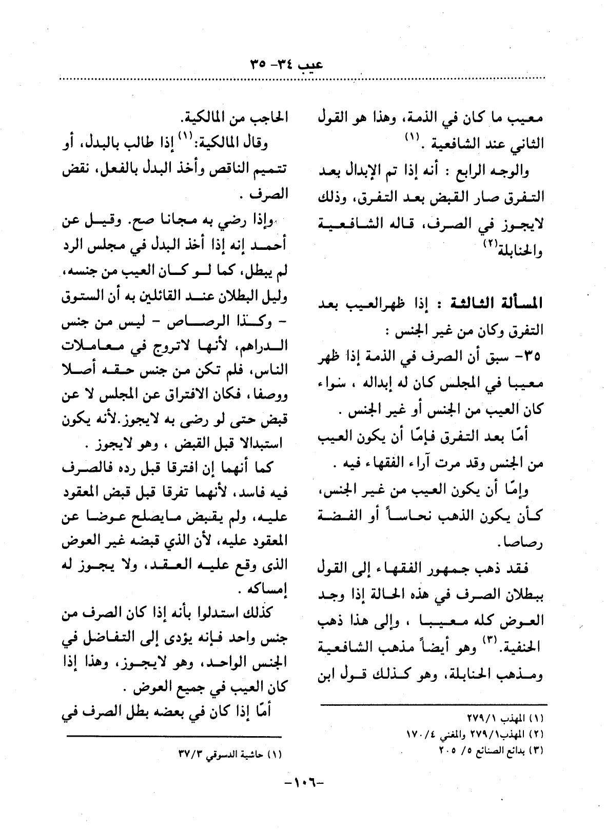 35 - سَبَقَ أَنَّ الصَّرْفَ فِي الذِّمَّةِ إِذَا ظَهَرَ مَعِيبًا فِي الْمَجْلِسِ كَانَ لَهُ إِبْدَالُهُ. سَوَاءٌ كَانَ الْعَيْبُ مِنَ الْجِنْسِ أَوْ غَيْرِ الْجِنْسِ.