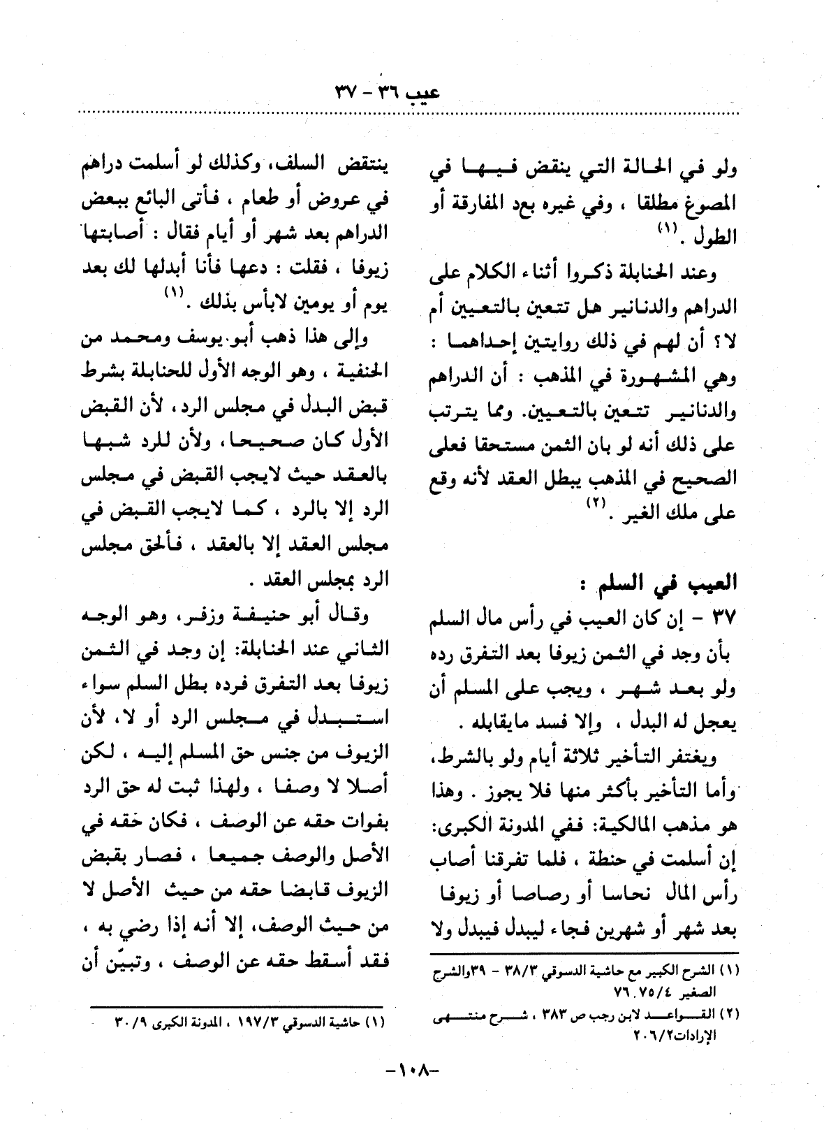 37 - إِنْ كَانَ الْعَيْبُ فِي رَأْسِ مَال السَّلَمِ بِأَنْ وَجَدَ فِي الثَّمَنِ زُيُوفًا بَعْدَ التَّفَرُّقِ رَدَّهُ وَلَوْ بَعْدَ شَهْرٍ، وَيَجِبُ عَلَى الْمُسْلِمِ أَنْ يُعَجِّل لَهُ الْبَدَل، وَإِلاَّ فَسَدَ مَا يُقَابِلُهُ.