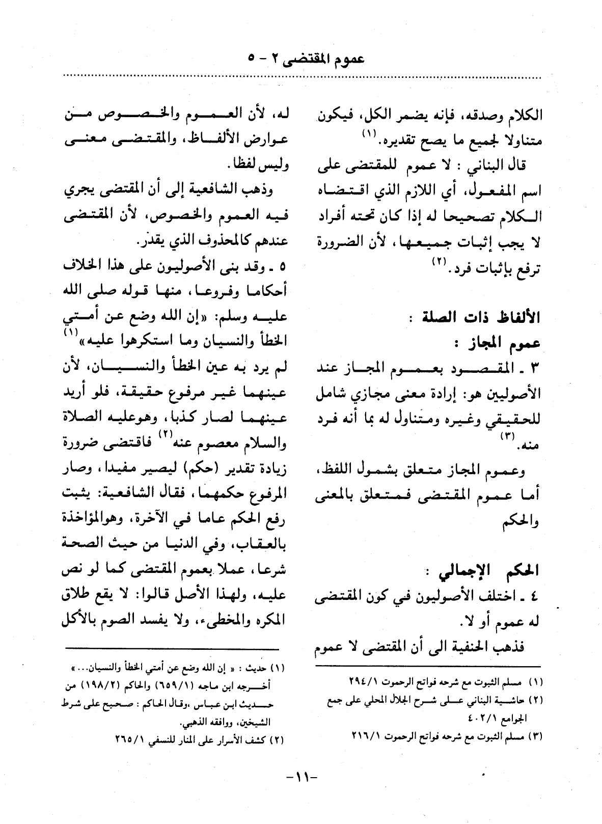 4 - اخْتَلَفَ الأُْصُولِيُّونَ فِي كَوْنِ الْمُقْتَضَى لَهُ عُمُومٌ أَوْ لاَ. فَذَهَبَ الْحَنَفِيَّةُ إِلَى أَنَّ الْمُقْتَضَى لاَ عُمُومَ