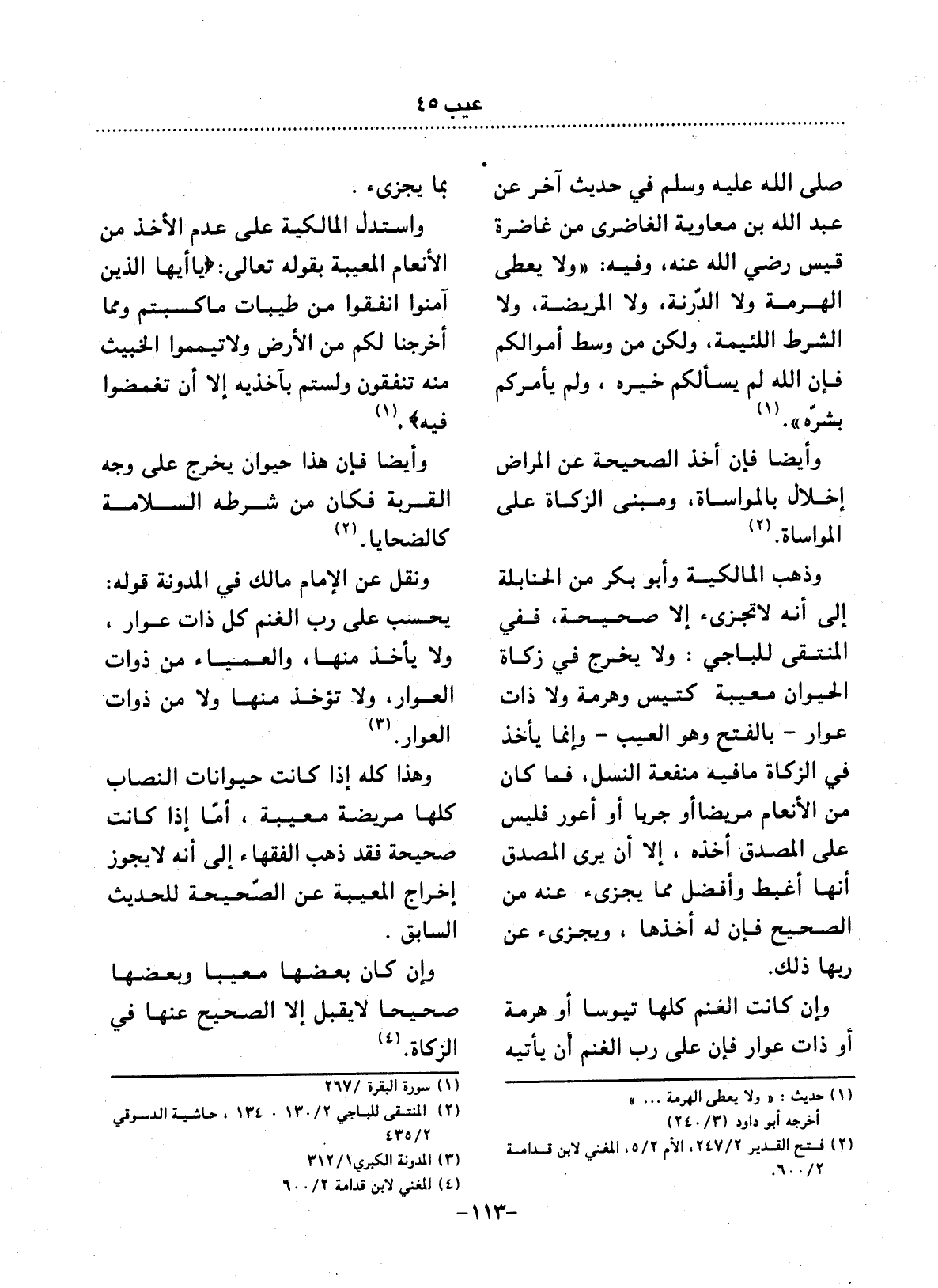صَلَّى اللَّهُ عَلَيْهِ وَسَلَّمَ فِي حَدِيثٍ آخَرَ عَنْ عَبْدِ اللَّهِ بْنِ مُعَاوِيَةَ الْغَاضِرِيِّ مِنْ غَاضِرَةِ قَيْسٍ رَضِيَ اللَّهُ عَنْهُ وَفِيهِ: وَلاَ يُعْطِي الْهَرِمَةَ وَلاَ الدَّرَنَةَ، وَلاَ الْمَرِيضَةَ، وَلاَ الشَّرَطَ اللَّئِيمَةَ، وَلَكِنْ مِنْ وَسَطِ أَمْوَالِكُمْ فَإِنَّ اللَّهَ لَمْ يَسْأَلْكُمْ خَيْرَهُ، وَلَمْ يَأْمُرْكُمْ بِشَرِّهِ (1) .