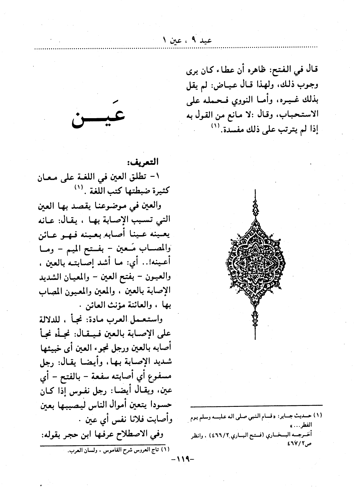 1 - تُطْلَقُ الْعَيْنُ فِي اللُّغَةِ عَلَى مَعَانٍ كَثِيرَةٍ ضَبَطَتْهَا كُتُبُ اللُّغَةِ (1) .