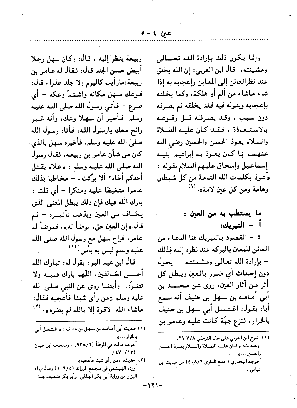 5 - الْمَقْصُودُ بِالتَّبْرِيكِ هُنَا الدُّعَاءُ مِنَ الْعَائِنِ لِلْمَعِينِ بِالْبَرَكَةِ عِنْدَ نَظَرِهِ إِلَيْهِ فَذَلِكَ - بِإِرَادَةِ اللَّهِ تَعَالَى وَمَشِيئَتِهِ - يَحُول دُونَ إِحْدَاثِ أَيِّ ضَرَرٍ بِالْمَعِينِ وَيُبْطِل كُل أَثَرٍ مِنْ آثَارِ الْعَيْنِ رُوِيَ عَنْ مُحَمَّدِ بْنِ أَبِي أُمَامَةَ بْنِ سَهْل بْنِ حُنَيْفٍ أَنَّهُ سَمِعَ أَبَاهُ يَقُول: اغْتَسَل أَبِي سَهْل بْنُ حُنَيْفٍ بِالْخَرَّارِ، فَنَزَعَ جُبَّةً كَانَتْ عَلَيْهِ وَعَامِرُ بْنُ