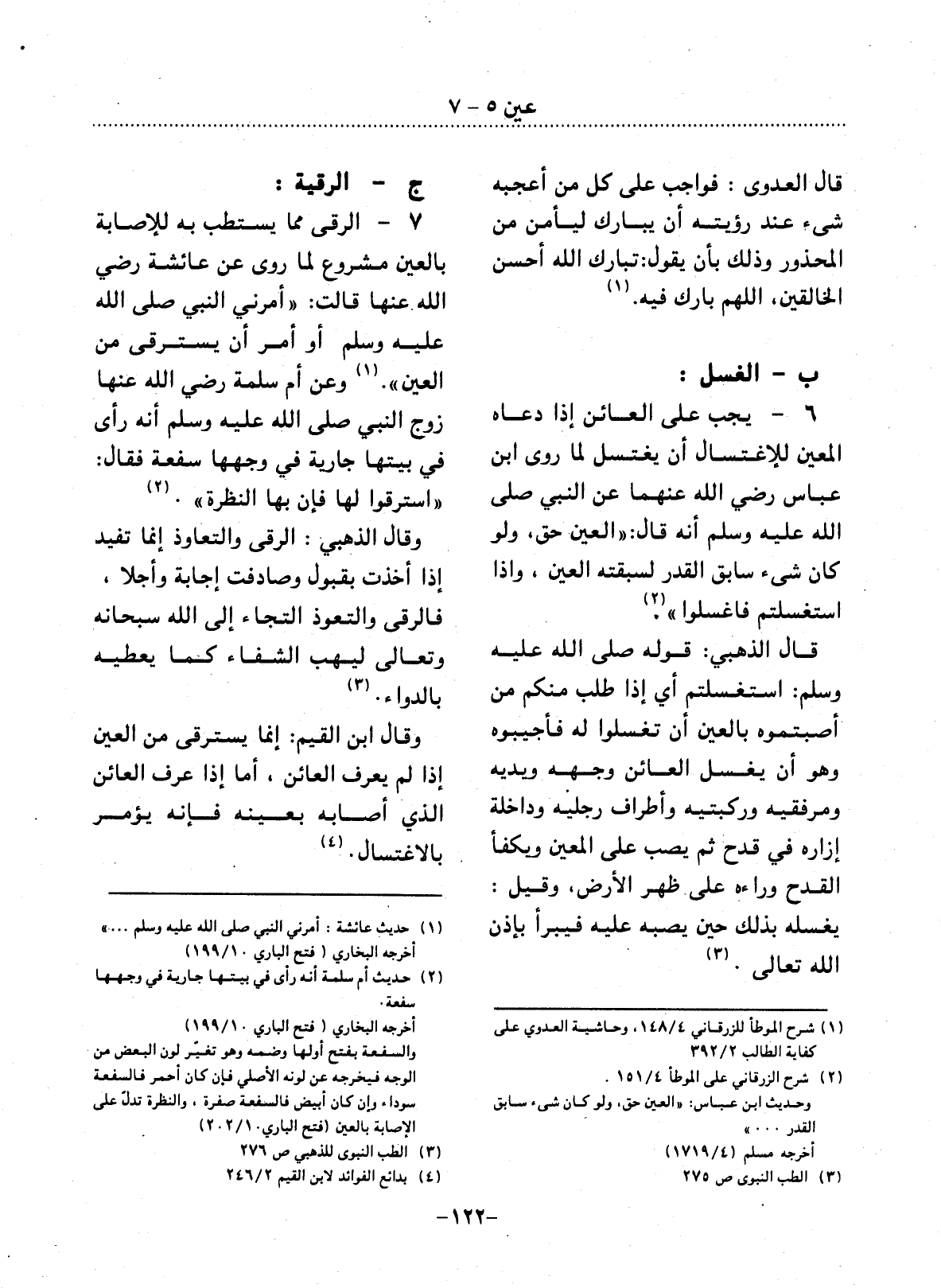 (2) حديث أم سلمة أنه رأى في بيتها جارية في وجهها سفعة. أخرجه البخاري (فتح الباري 10 / 199) . والسفعة بفتح أولها وضمه، وهو تغير لون البعض من الوجه فيخرجه عن لونه الأصلي، فإن كان أحمر فالسفعة سوداء، وإن كان أبيض فالسفعة صفرة، والنظرة تدل على الإصابة بالعين (فتح الباري 10 / 202) .