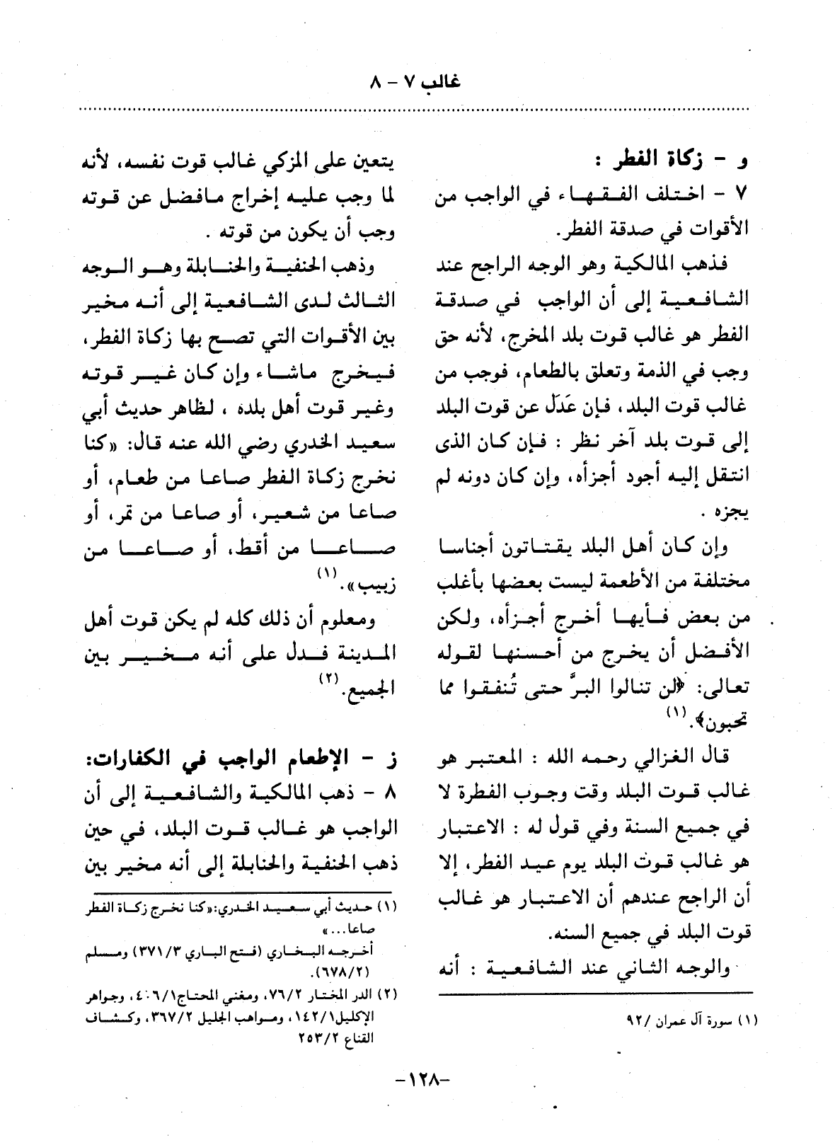 8 - ذَهَبَ الْمَالِكِيَّةُ وَالشَّافِعِيَّةُ إِلَى أَنَّ الْوَاجِبَ هُوَ غَالِبُ قُوتِ الْبَلْدَةِ، فِي حِينِ ذَهَبَ الْحَنَفِيَّةُ وَالْحَنَابِلَةُ إِلَى أَنَّهُ مُخَيَّرٌ بَيْنَ