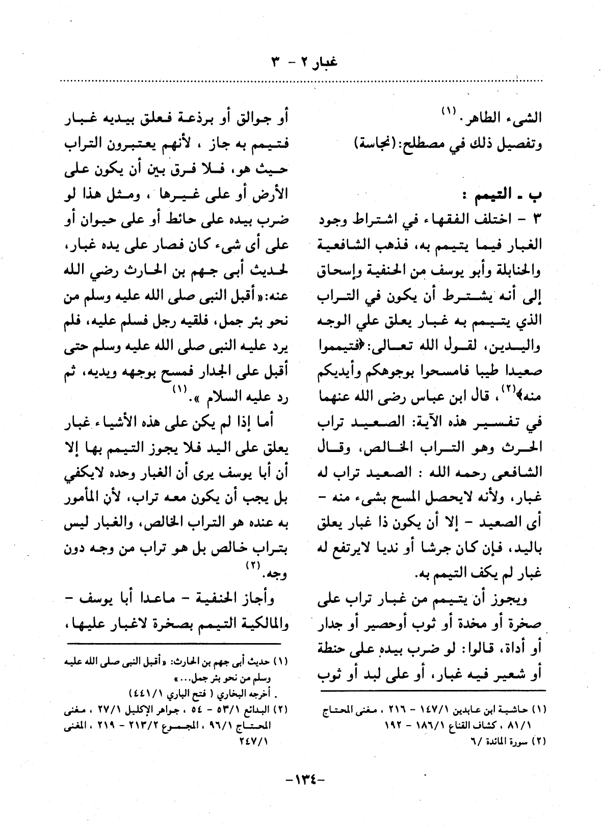 3 - اخْتَلَفَ الْفُقَهَاءُ فِي اشْتِرَاطِ وُجُودِ الْغُبَارِ فِيمَا يُتَيَمَّمُ بِهِ، فَذَهَبَ الشَّافِعِيَّةُ. وَالْحَنَابِلَةُ وَأَبُو يُوسُفَ مِنَ الْحَنَفِيَّةِ وَإِسْحَاقُ إِلَى أَنَّهُ يُشْتَرَطُ أَنْ يَكُونَ فِي التُّرَابِ الَّذِي يُتَيَمَّمُ بِهِ غُبَارٌ يَعْلَقُ عَلَى الْوَجْهِ وَالْيَدَيْنِ، لِقَوْل اللَّهِ تَعَالَى: {فَتَيَمَّمُوا صَعِيدًا طَيِّبًا فَامْسَحُوا بِوُجُوهِكُمْ وَأَيْدِيكُمْ مِنْهُ} (2) قَال ابْنُ عَبَّاسٍ رَضِيَ اللَّهُ عَنْهُمَا فِي تَفْسِيرِ هَذِهِ الآْيَةِ: الصَّعِيدُ تُرَابُ الْحَرْثِ وَهُوَ التُّرَابُ الْخَالِصُ، وَقَال الشَّافِعِيُّ رَحِمَهُ اللَّهُ: الصَّعِيدُ تُرَابٌ لَهُ غُبَارٌ؛ وَلأَِنَّهُ لاَ يَحْصُل الْمَسْحُ بِشَيْءٍ مِنْهُ - أَيِ الصَّعِيدِ - إِلاَّ أَنْ يَكُونَ ذَا غُبَارٍ يَعْلَقُ بِالْيَدِ، فَإِنْ كَانَ جَرْشًا أَوْ نَدِيًّا لاَ يَرْتَفِعُ لَهُ غُبَارٌ لَمْ يَكْفِ التَّيَمُّمُ بِهِ.