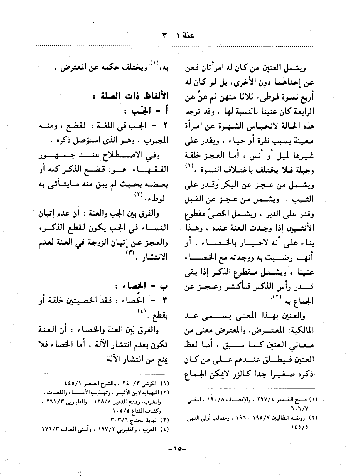 وَالْفَرْقُ بَيْنَ الْجَبِّ وَالْعُنَّةِ: أَنَّ عَدَمَ إِتْيَانِ النِّسَاءِ فِي الْجَبِّ يَكُونُ لِقَطْعِ الذَّكَرِ، وَالْعَجْزُ عَنْ إِتْيَانِ الزَّوْجَةِ فِي الْعُنَّةِ لِعَدَمِ الاِنْتِشَارِ (3) .